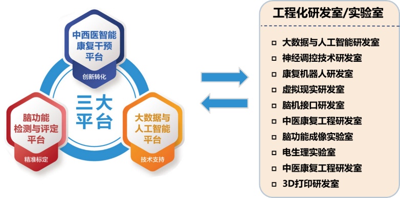 上海中医药大学中医智能康复教育部工程研究中心依托上海中医药大学康复医学院、中医工程中心和中药经典名方研究平台组建,重点围绕着脑卒中的偏瘫、失语,老年性痴呆的认知障碍和抑郁症的情感障碍等疾病的康复干预,构建海量多模态大数据库和云平台,开展机器学习和人工智能算法的研究,精准标定有助于功能恢复的关键神经环路,制定个体化、精准化的中医智能康复治疗方案,全面推进脑科学临床与类脑智能研究深度融合。工程中心构建了脑功能检测与评定、中西医智能康复干预和大数据与人工智能三大平台,成立了十个工程化研发室及实验室,目前获得了4个第二类医疗器械注册证,包括下肢康复训练系统、认知康复训练系统、言语认知康复训练系统和舌诊仪。