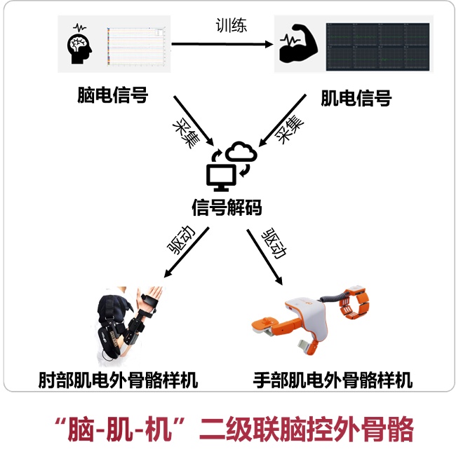 徐建光教授团队针对现有脑机接口技术稳定性差、识别困难不稳定的难题,提出“脑-肌-机”二级联的脑控外骨骼创新理念技术。脑-肌-机接口是一套通过强化训练脑-肌电耦合,利用脑电信号对肌电信号进行训练,从而重建中枢与周围神经的连接,进一步通过肌电信号控制外骨骼,辅助手部运动功能障碍患者实现运动的康复系统。该系统改变了以往以恢复单纯肢体动作为目标的康复模式,创新性地提出了恢复脑-肌电耦合的新康复策略,降低康复难度,缩短康复进程,旨在帮助患者尽快恢复手功能。