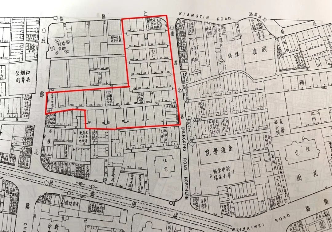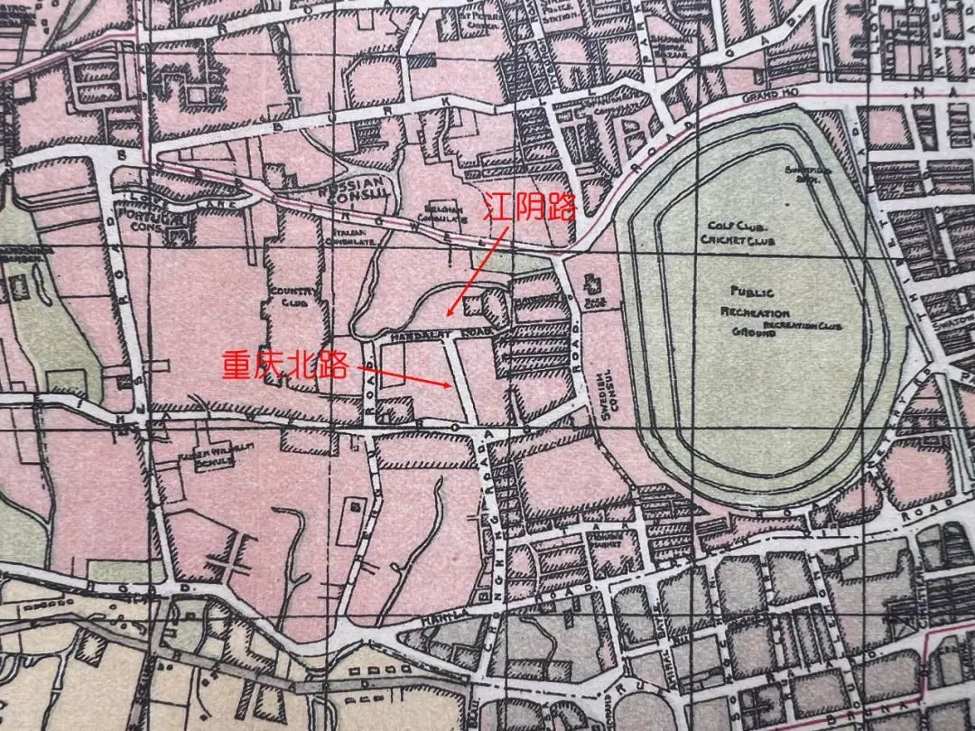 关于江阴路具体辟筑时间,据馆藏城建档案中相关年份的公共租界西区道路规划图,1912年时,其填浜筑路已在计划中。与之呼应的则是The China survey Co.于1912年5月编制的“Map of Shanghai”一图。据后者可知彼时今江阴路57号以东路段已筑成,以西则尚为一小浜。1913年10月,The China survey Co. 再次编制“Map of Shanghai”,为前述1912年同名地图的修订版,此时整条路已修筑完成,由此推断江阴路应在1912年下半年至1913年间筑成。此外,据上述地图资料可知,与江阴路相交的重庆北路,也在同一时期筑成。“Map of Shanghai”,1913年10月