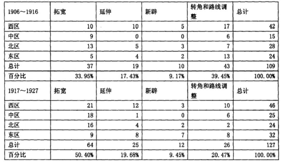 根据孙倩《上海近代城市建设管理制度及其对公共空间的影响》一文中对1906-1927年期间公共租界工部局颁布的道路计划(包括新辟、延伸、拓宽等)的统计,江阴-顺天村地区所在的西区是当时公共租界道路建设最活跃的区域,江阴路、重庆北路在1912、1913年期间的相继筑成,正是20世纪初这一区域快速城市化的缩影与写照。1906-1927年期间公共租界工部局颁布的道路计划(包括新辟、延伸、拓宽等)的统计,来源:《上海近代城市建设管理制度及其对公共空间的影响》