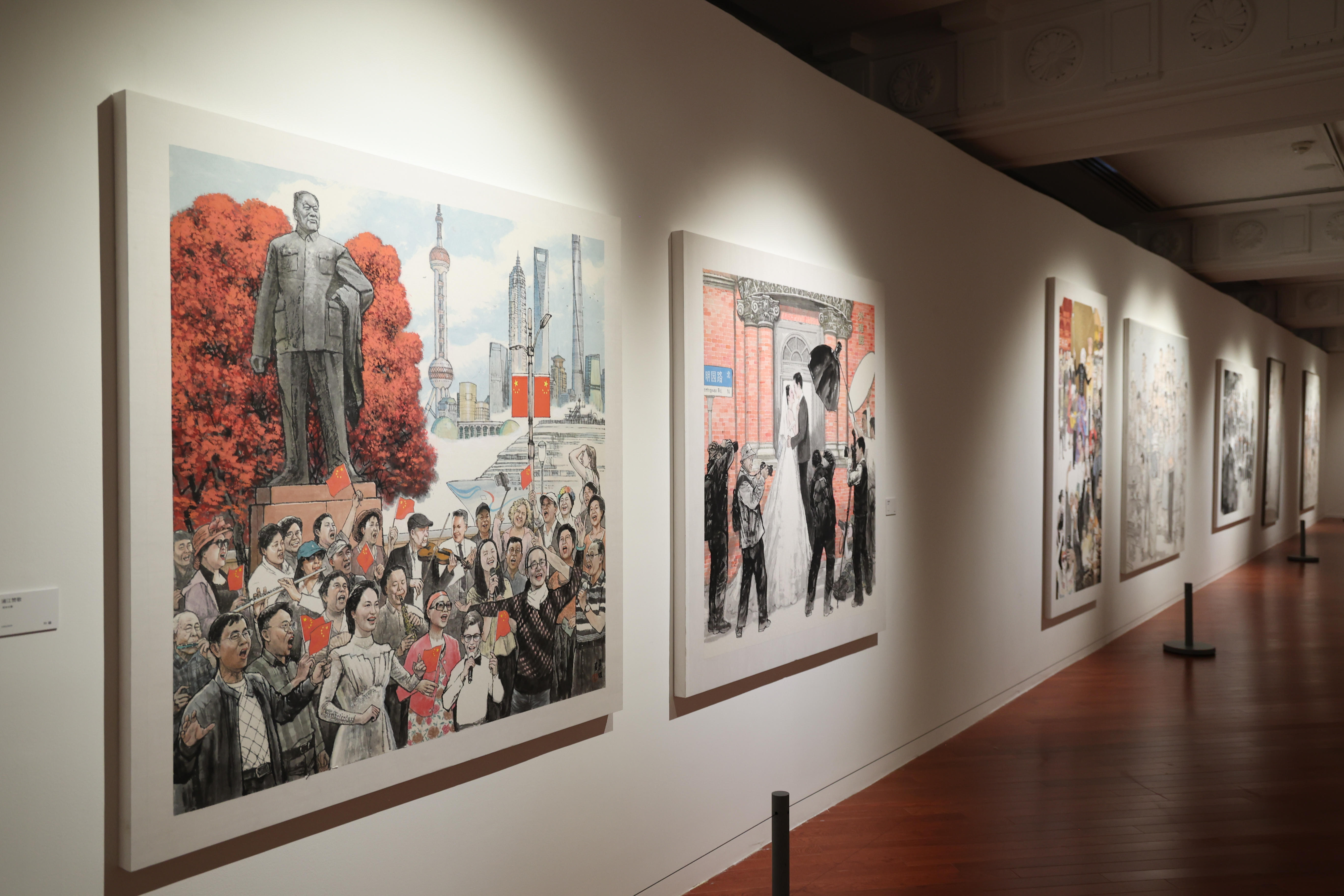 愉快的合作让这群志同道合的人凝聚在一起,“我们来自上海,自然要用作品反映上海。如今,社会发展得这么快,新气象新事物那么多,作为本土艺术家就应该多表达。”于是以上海历史上的重大事件、地标为题材的“繁花似锦——人物画苑国庆75周年作品展”应运而生。