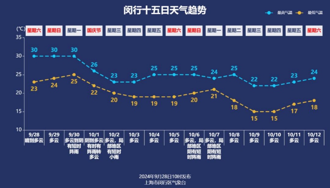 冷空气10月1日前后开始影响申城,冷暖气流交汇,将带来阵雨。10月1日—10月3日气温明显下降,48小时最高温度降幅可达6—8℃,10月2—10月3日最高气温降至23℃,最低气温可能跌到19℃左右,外出游玩需要加外套喽!3—5日天空状况转好,多云为主,天气适宜,10月6日—10月7日局部有短时阵雨,备好雨具,出行无忧。