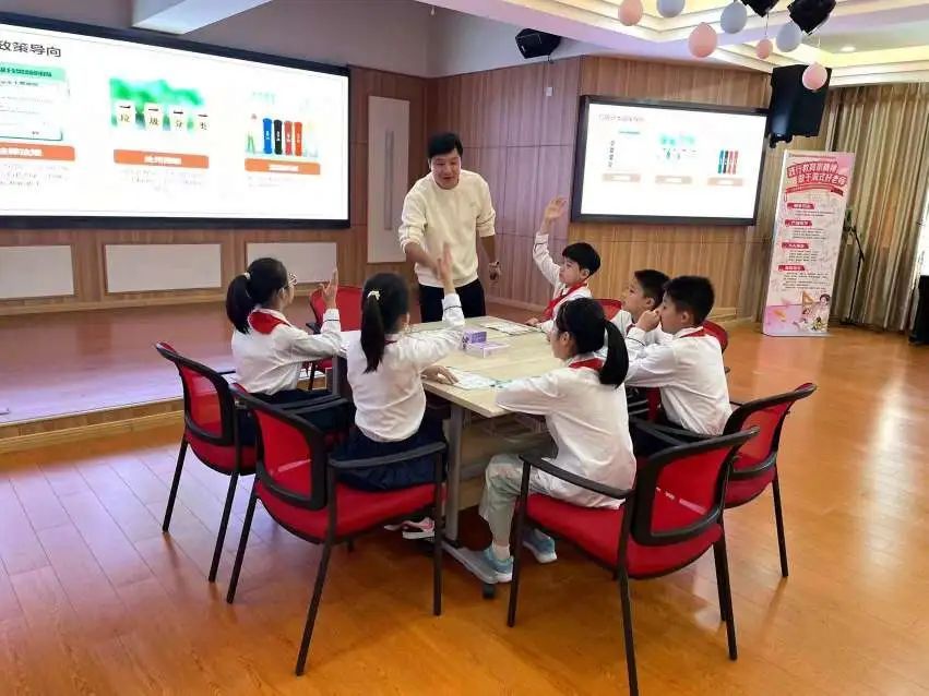 在陈鹤琴小学活动现场,垃圾分类指导老师用生动的案例和游戏互动的方式,详细讲解了垃圾四分类、可回收物精细化分类的相关知识点和案例。