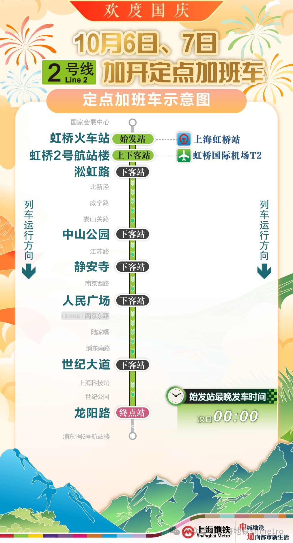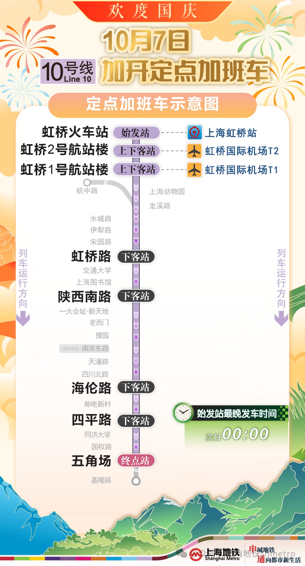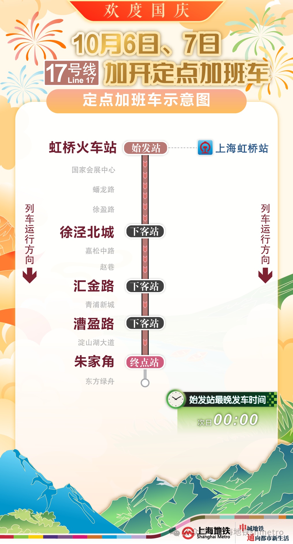 为提升国庆返程期间重要交通枢纽夜间疏散能力,根据计划,10月6日,地铁2、17号线将加开定点加班车;10月7日,地铁1、2、10、17号线也将加开定点加班车,末班车发车时间延长至次日0点,定点加开列车途经换乘站均暂停换乘服务。同时,地铁运营方还将密切关注虹桥枢纽夜间客流情况,根据现场客流需求或将进一步延长定点加班车开行时间。