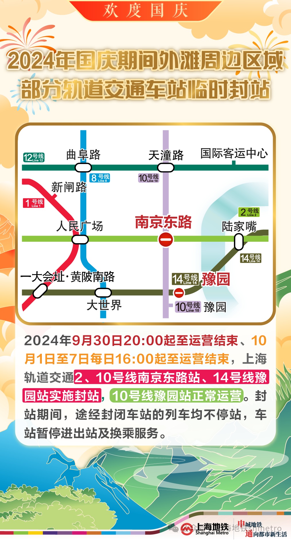 配合交通管制,9月30日20:00起,10月1日至7日每日16:00起 2、10号线南京东路站及14号线豫园站封站。