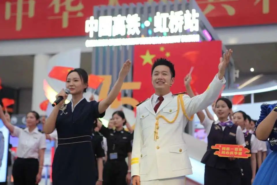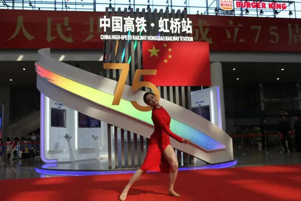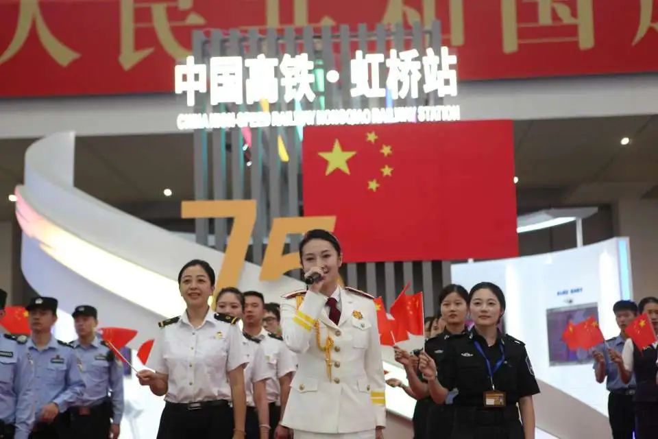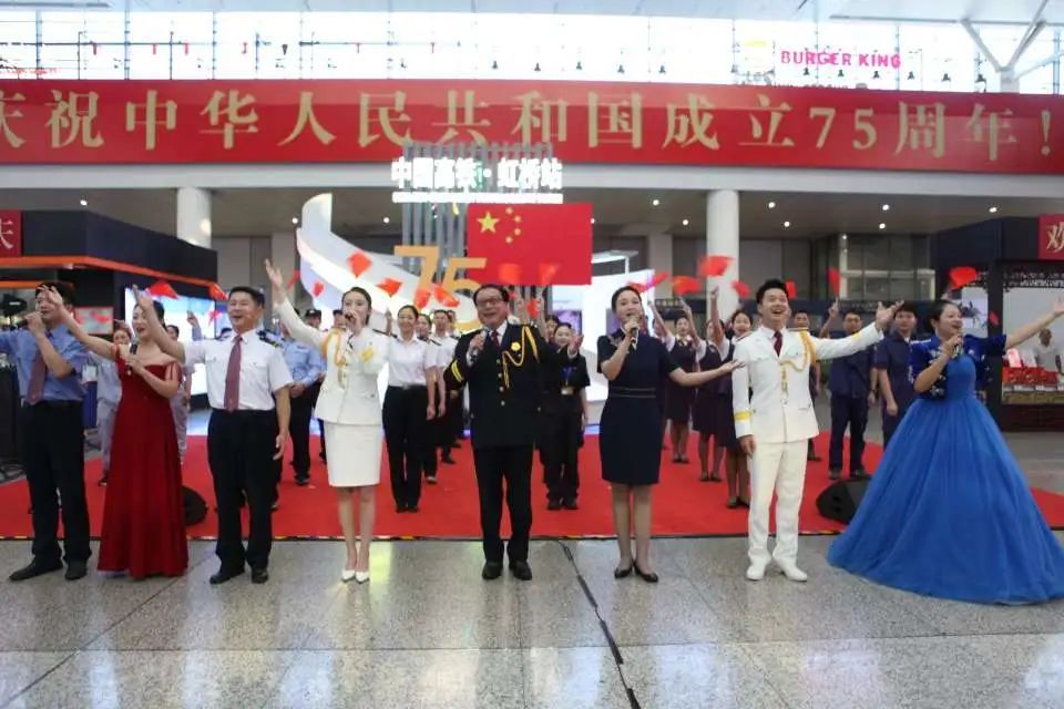 为了节日氛围,上海虹桥站候车室内提前挂起国旗、设置国庆“打卡点”、电子显示屏“庆祝中华人民共和国成立75周年”的海报。现场,中国上海国际艺术节中心演职人员、铁路工作人员与在场的旅客共同合唱歌曲《我和我的祖国》,向祖国献上最诚挚的节日祝福。