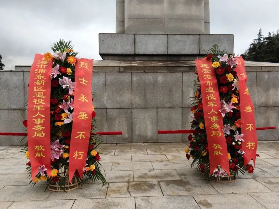 当天,高桥烈士陵园庄严肃穆。全场肃立,高唱国歌,向人民英雄致以最崇高的敬意。在深情的《献花曲》中,礼兵郑重抬起花篮,缓步走向纪念碑,将花篮整齐敬放在烈士纪念碑前。连云港市退役军人事务局和浦东新区退役军人事务局的相关负责人,分别整理花篮缎带,向革命先烈表达崇高的敬意和无限的哀思。