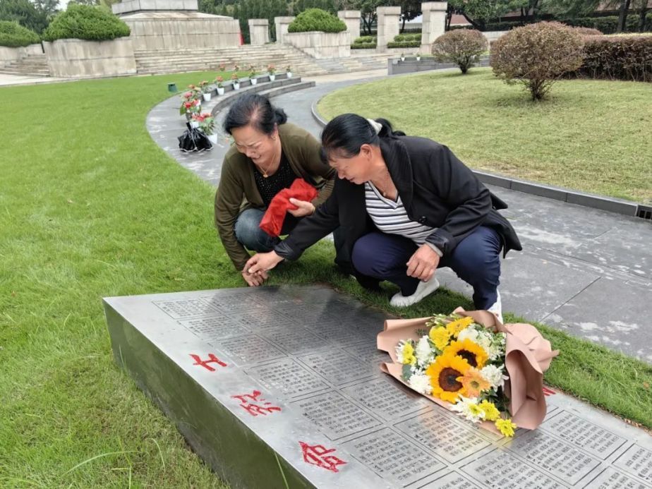 祭扫仪式结束后,在新区烈保中心讲解员的带领下,全体人员瞻仰了烈士墓区并向烈士英名墙献花。季克兰还将专程从家乡带来的土壤,洒在了烈士墓区内,祭奠“二爷”季根清。情到深处,她眼泪满眶。