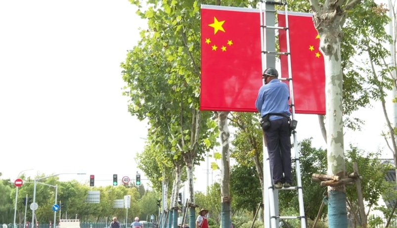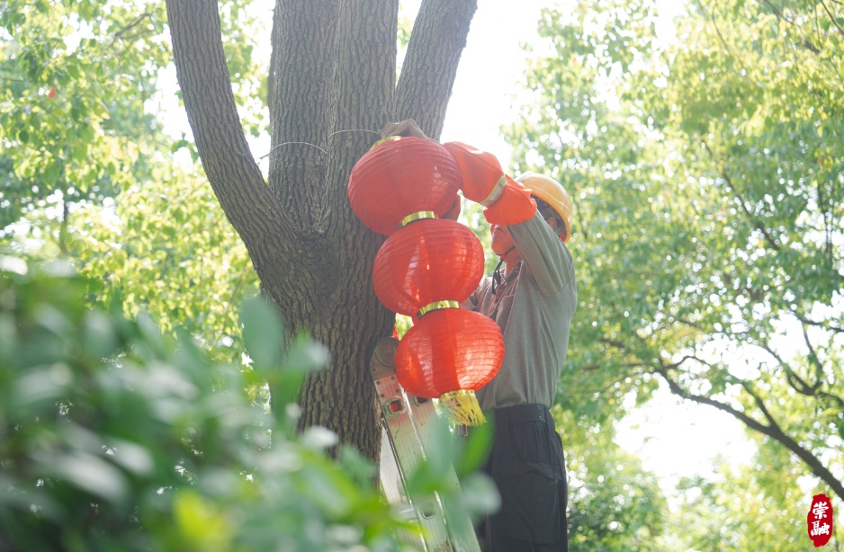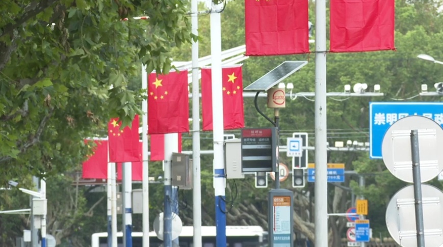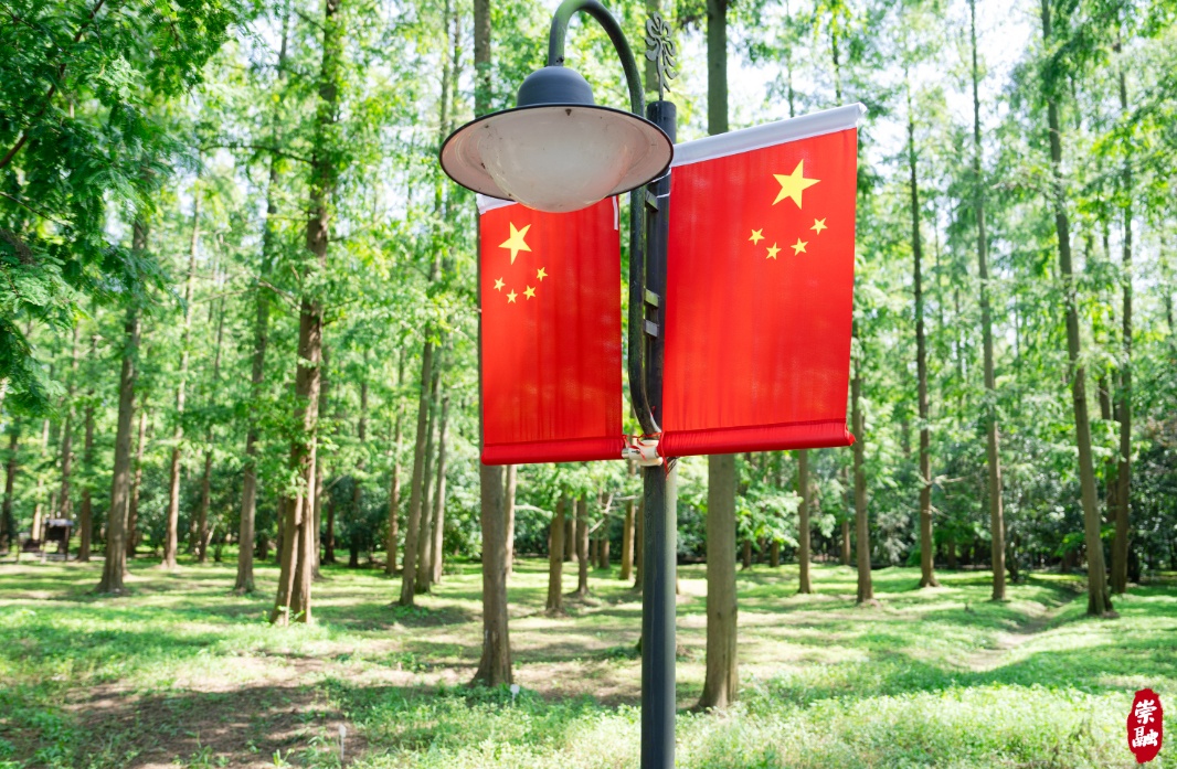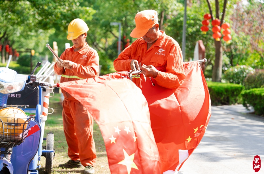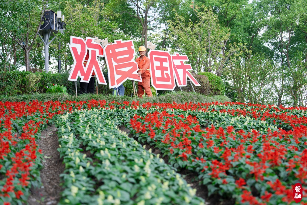 国庆节即将到来,近日,崇明城区主干道、各乡镇主要道路悬挂起一面面鲜红的五星红旗,公园内各类花卉装扮一新,呈现出浓浓的节日氛围。