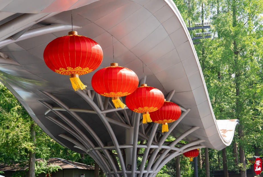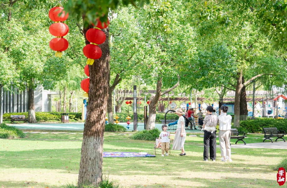 新城公园内,一串串喜庆的红色灯笼挂满枝头,不少市民或坐在草坪间休憩,或带着孩子在草地上奔跑嬉戏。
