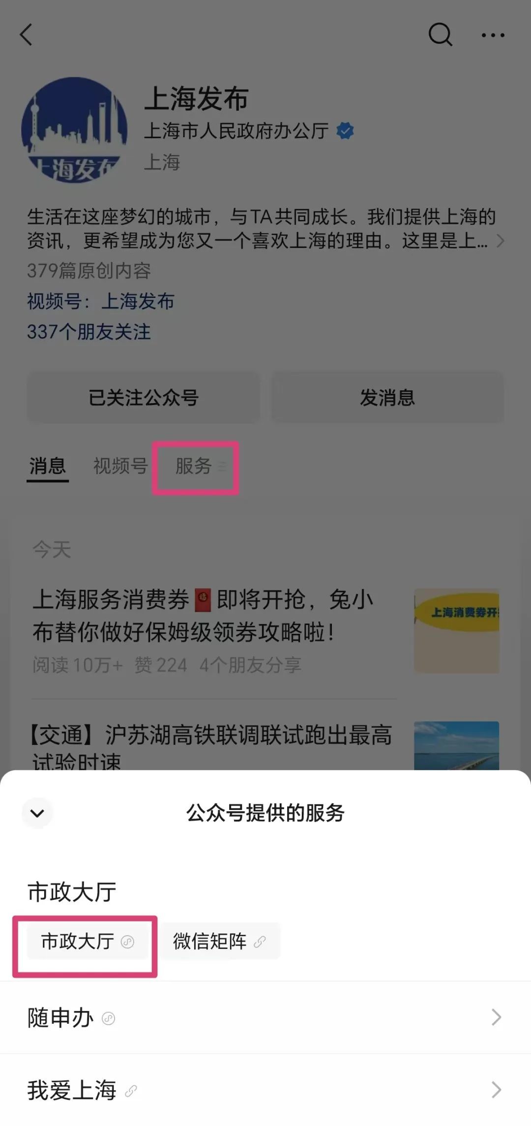 1、关注“上海发布”公众号后,点击“服务”,弹出“公众号提供的服务”框后点击“市政大厅”。