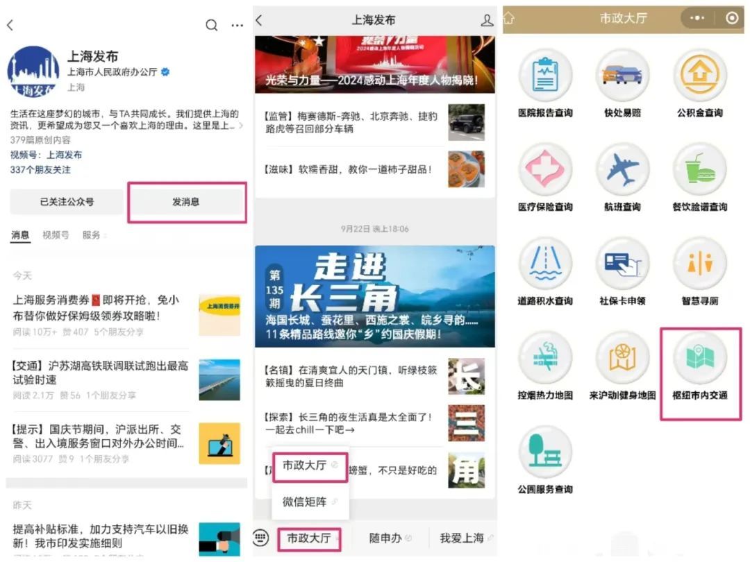 关注“上海发布”后点击“发消息”,进入消息页面后点击“市政大厅”,在弹出功能框后点击“市政大厅”即可进入服务页面,然后下滑找到“枢纽市内交通”服务,后续查阅步骤和方法一相同。