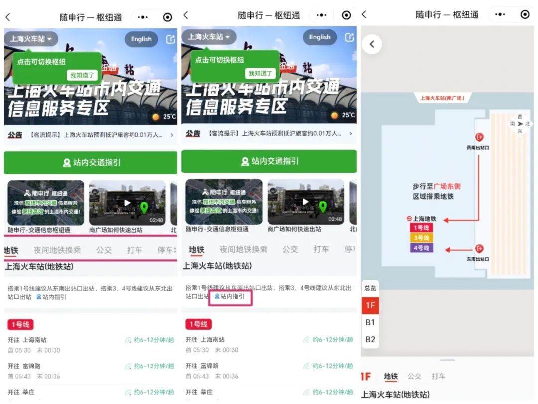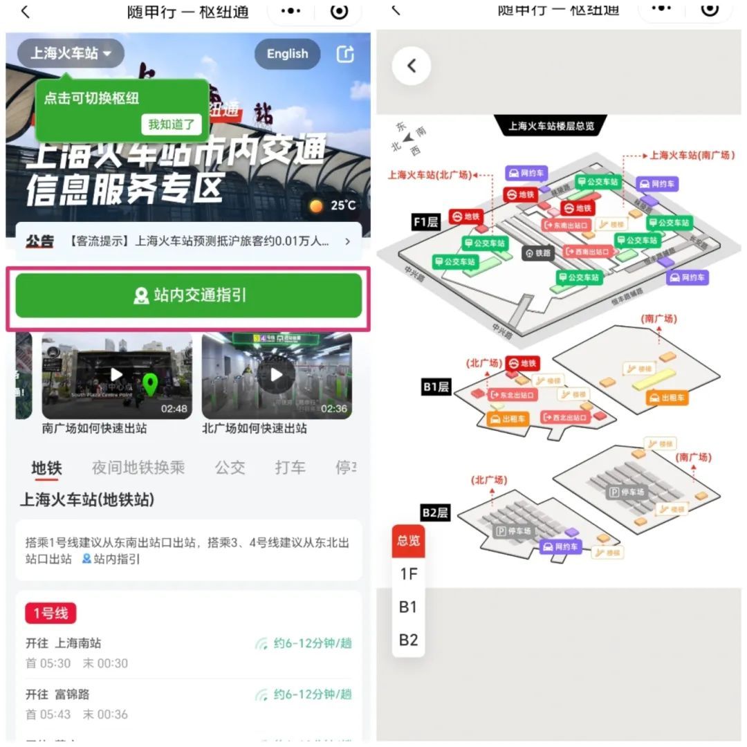 3、以上海火车站为例,点击进入后即可看到“站内交通指引”,点击进入后可看到站内交通全貌图,游客也可根据自身需要单独选择所处楼层,按照地图行走。