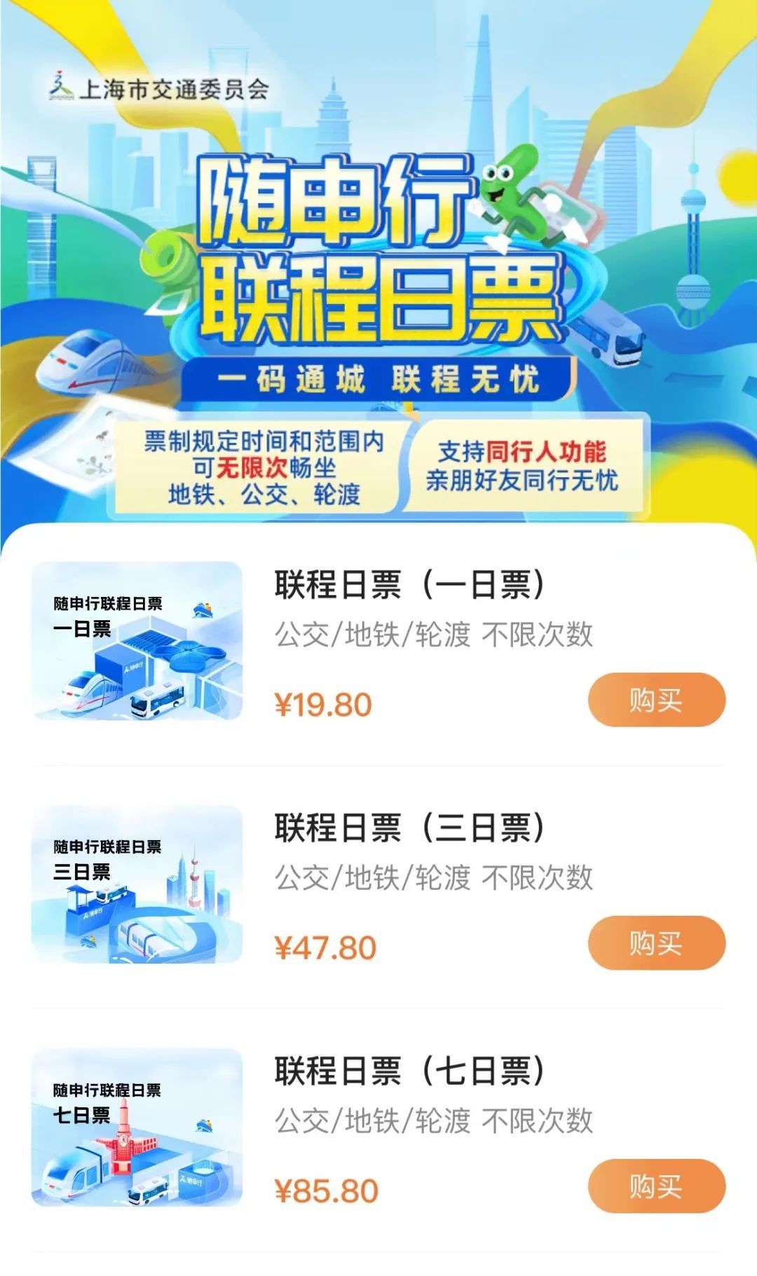 “联程日票”还有47.8元的三日票与85.8元的七日票可供选择,最低12.8元/天,还支持一部手机同时为至多2位同行人一起购买,包揽一家人整个假期的出行!
