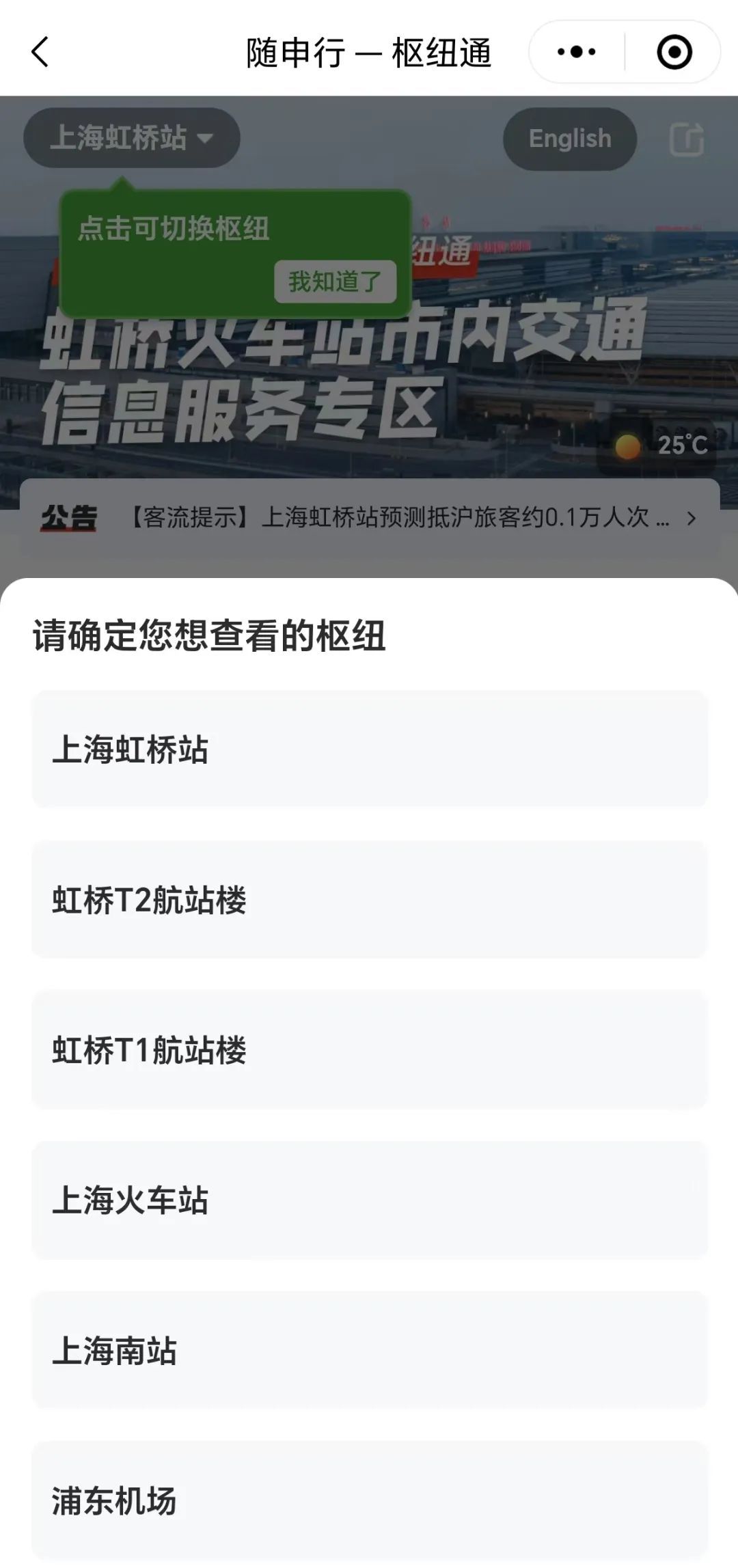 在“上海发布”公众号内,点击“枢纽市内交通”专区,系统将根据用户的当前位置自动推荐就近的枢纽场站,上海“两场三站”都支持切换查询。具体查询方法如下:
