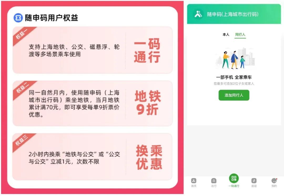 2.一部手机可至多添加2名“同行人”共同乘车,方便让老人、小孩等不便使用手机的同行乘客依次刷码,假期首笔同行人订单还有5折优惠噢!(详见“随申行周年庆”活动)