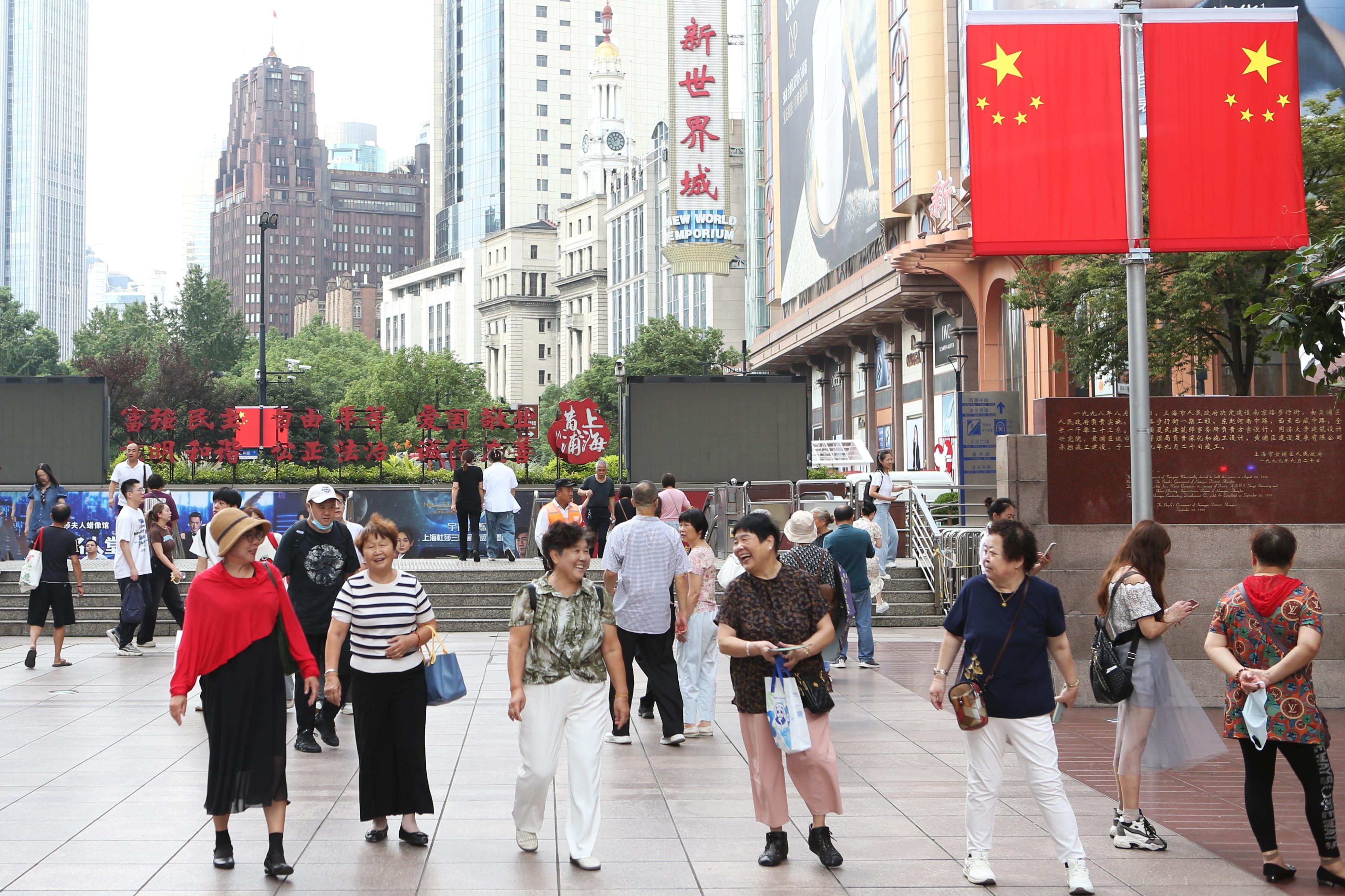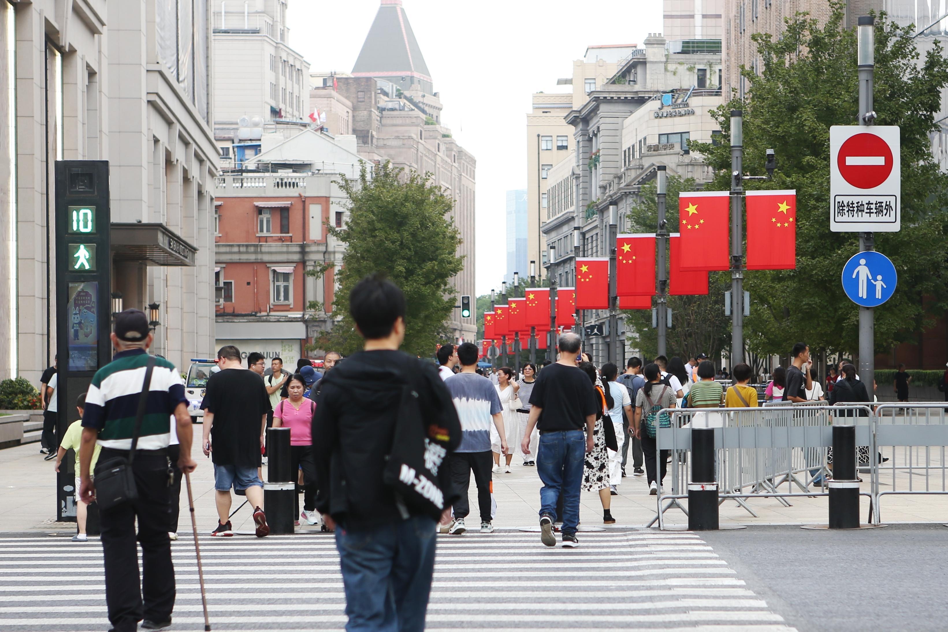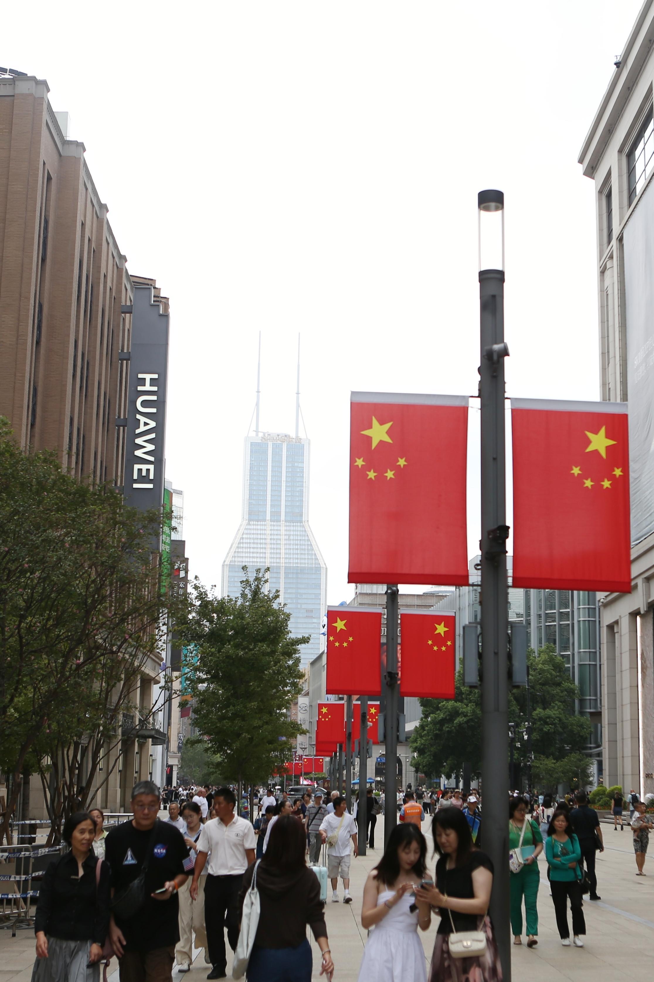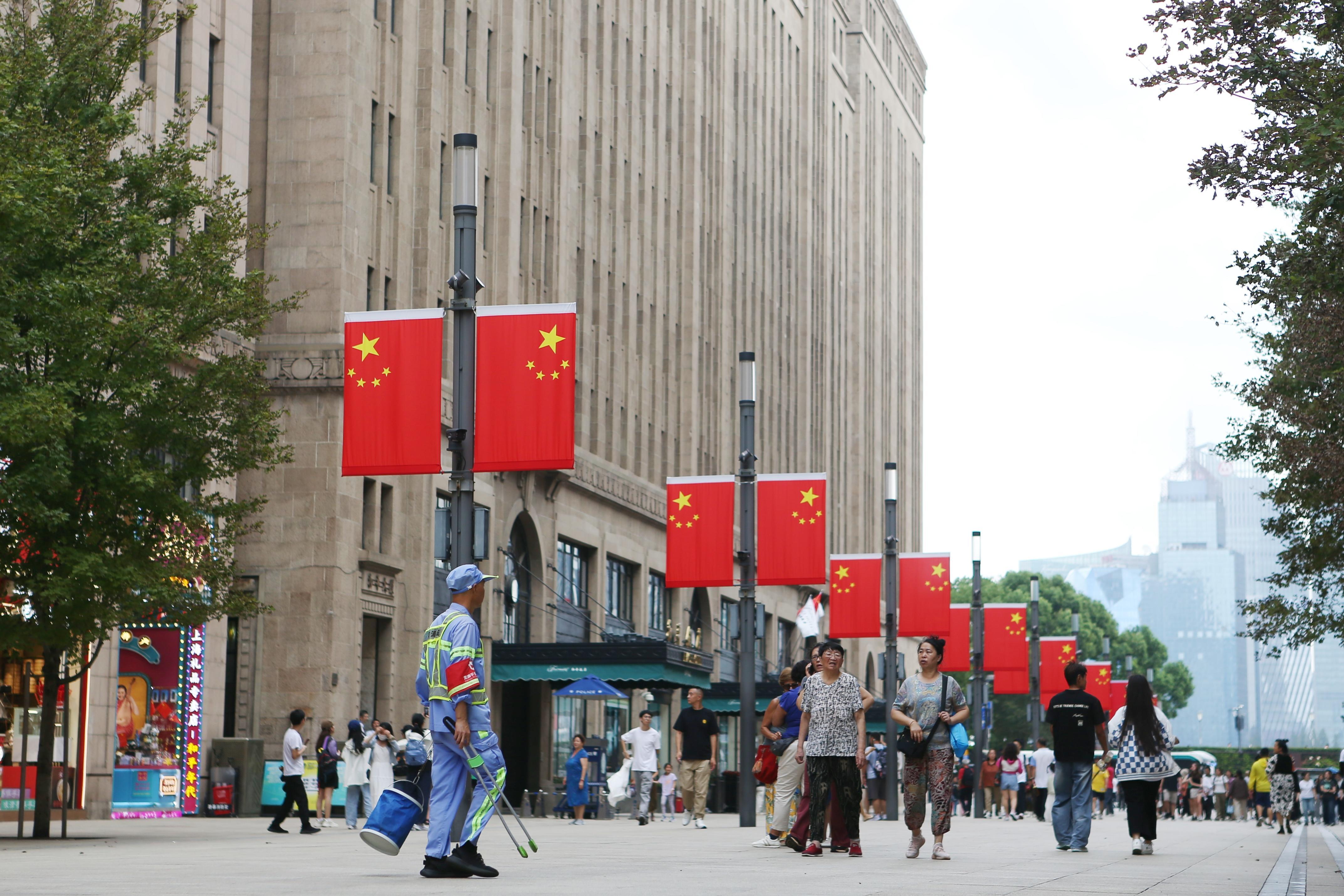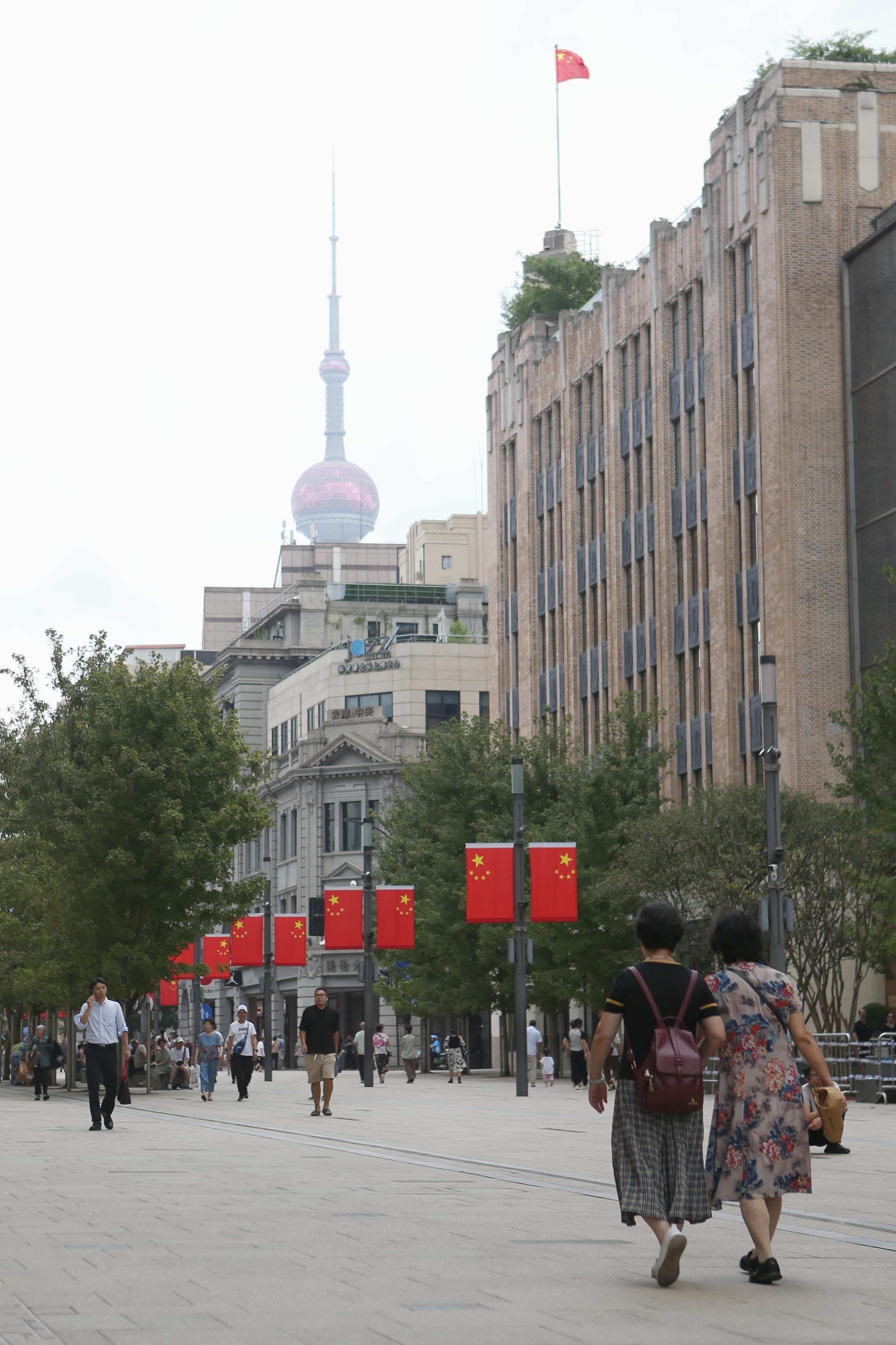 记者在现场看到,从人民广场的新世界城,一直到外滩的和平饭店,五星红旗贯穿了整条步行街。尽管是工作日,步行街依然熙熙攘攘、游人如织。飘扬的五星红旗让游客感受到了浓浓的节日氛围,许多路人不时对着国旗自拍或合影,留下了一张张灿烂的笑脸。