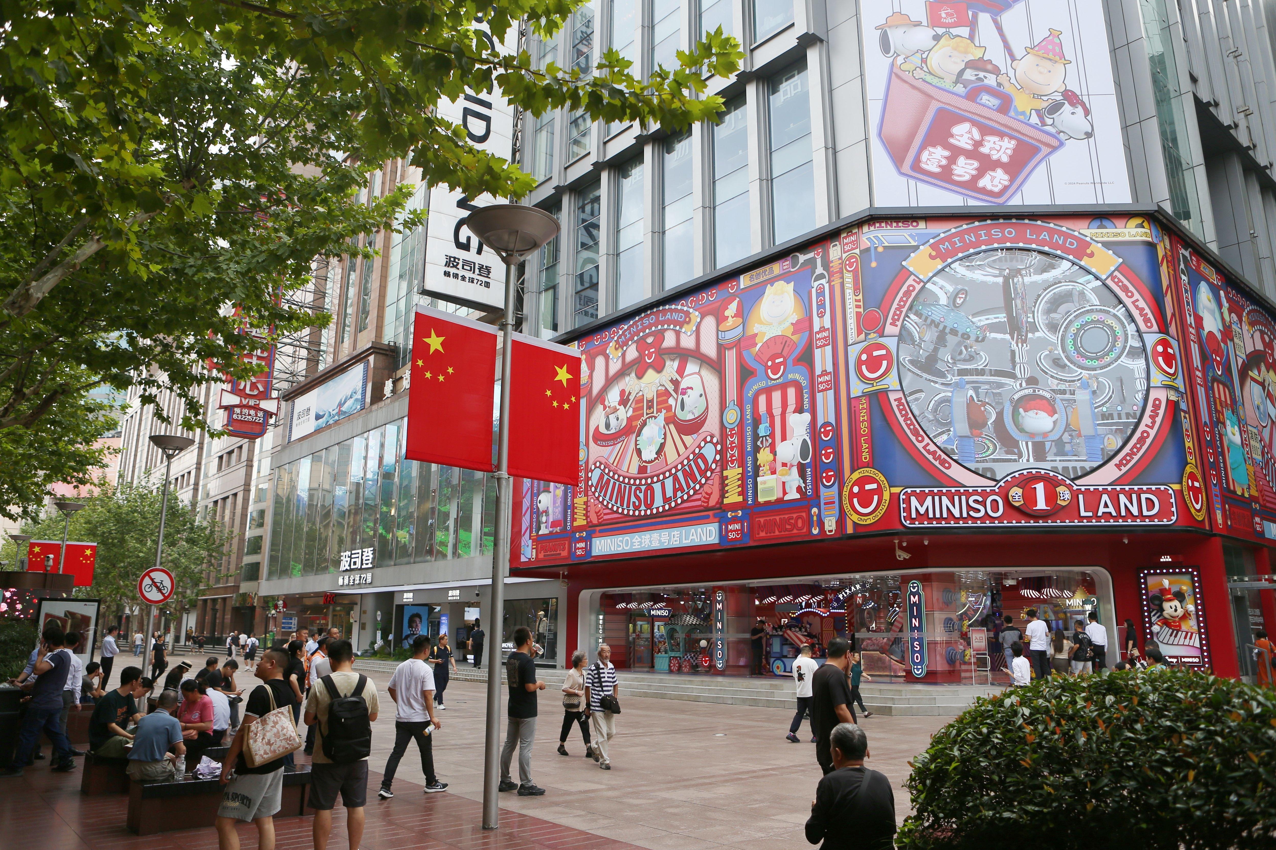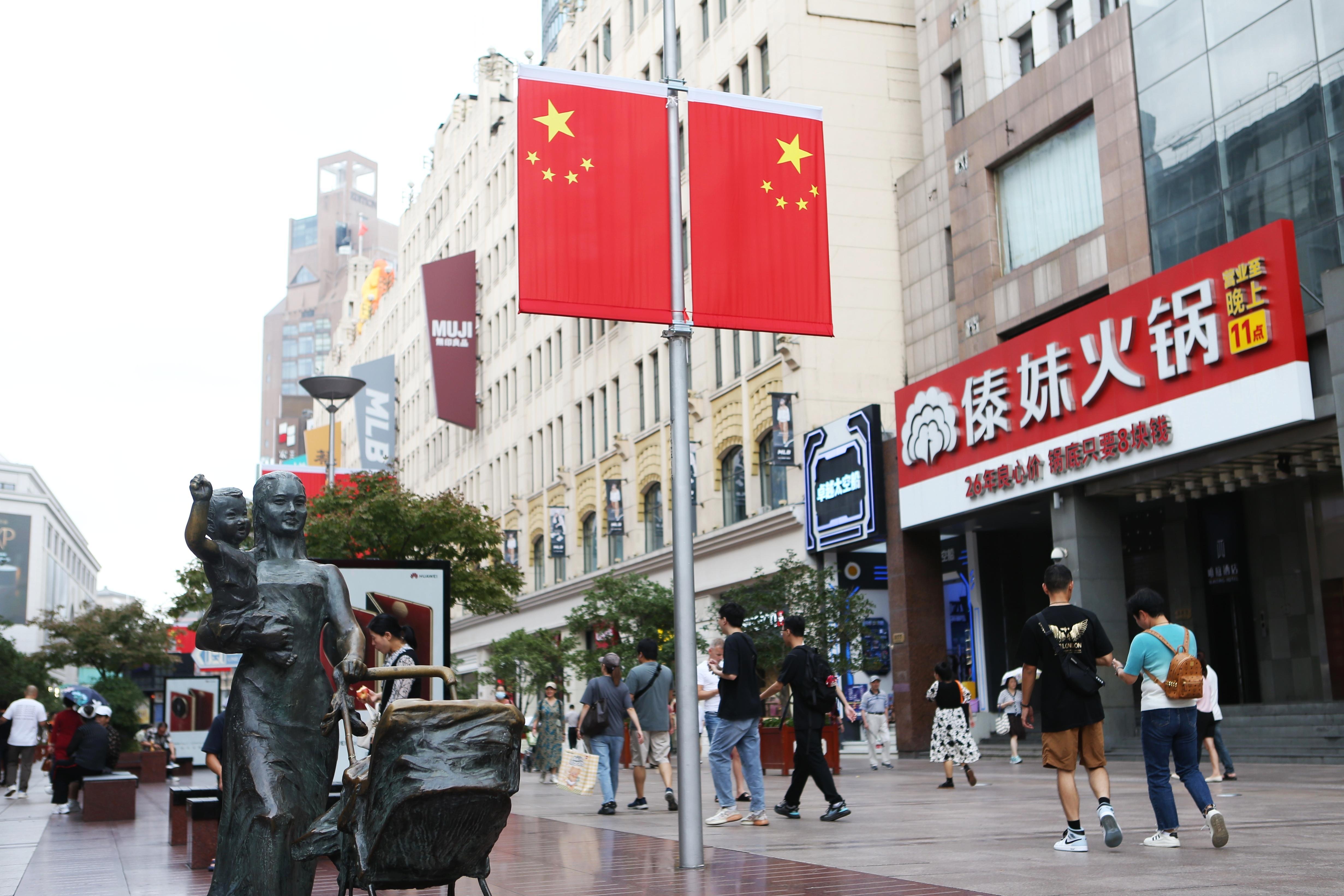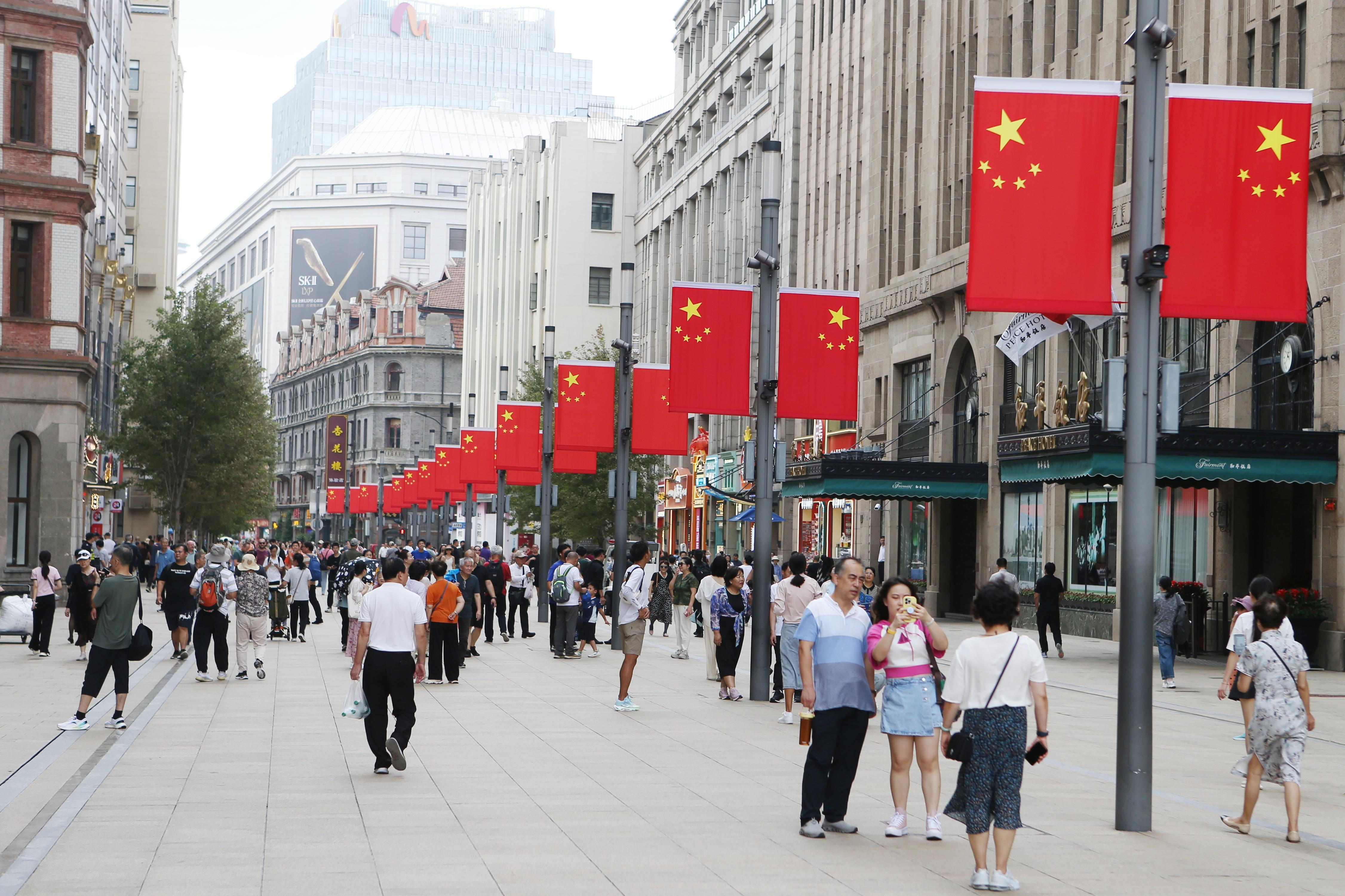 为庆祝中华人民共和国成立75周年,9月30日,南京路步行街按以往惯例,在街中心悬挂起了一排鲜艳的国旗。远远望去,一面面五星红旗迎风飘扬,一抹抹鲜艳的“中国红”成为步行街亮丽的风景线,在阳光下闪耀着温暖的光芒,热烈而富有生命力。