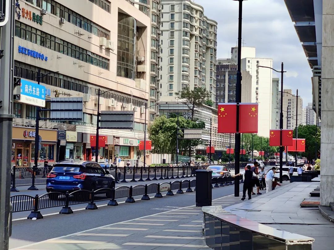 在徐汇多个主干道,一面面鲜艳的五星红旗整齐排列,漕溪北路、南丹东路等路段,喜庆的红色和郁郁葱葱的绿化树相映成趣,衬着秋日和煦的阳光,洋溢起浓厚的节日气氛。