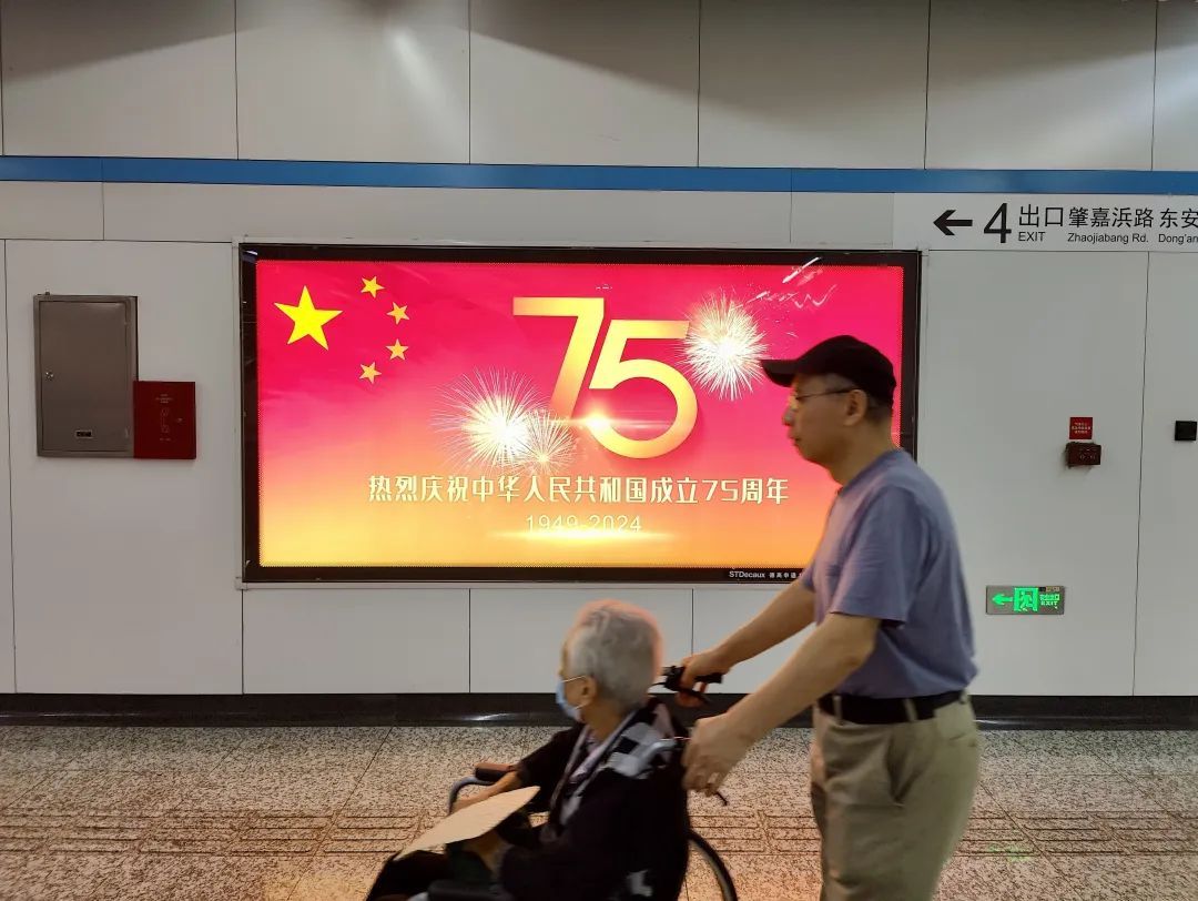 在徐家汇商圈,户外的巨型广告牌悬着“75字样”的主题海报,地铁内也挂起“中国红”的旗帜、点亮“庆祝75周年华诞”的灯箱,记录着岁月的辉煌与沧桑。