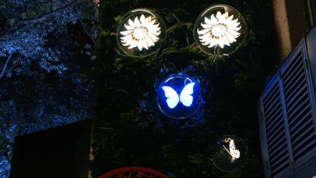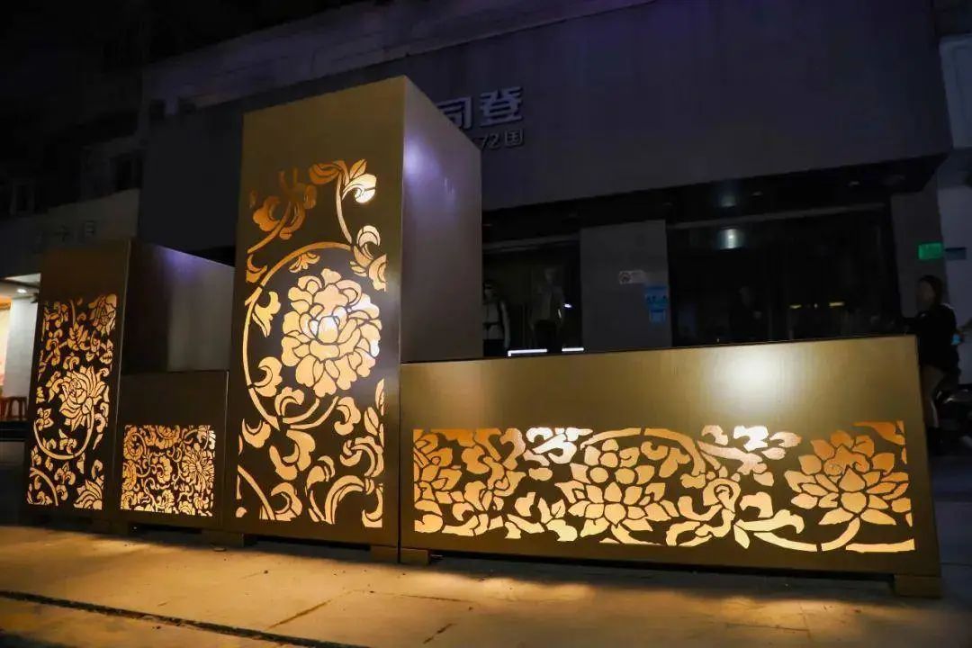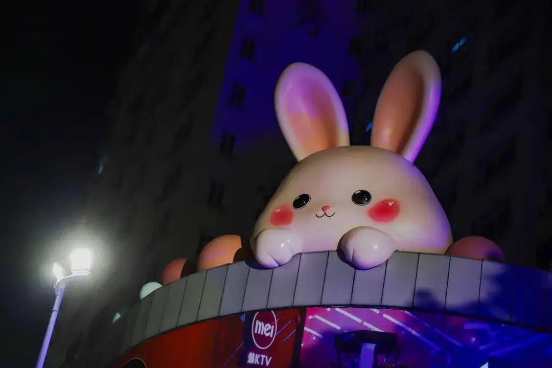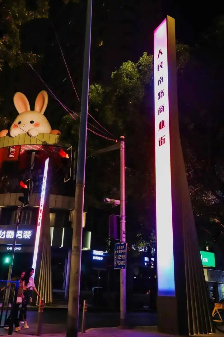 在人民南路路口,两把倒置的折扇造型通过现代线条的解构,形成了一道链接古典和现代的时光之门。充满艺术化的灯光门头增加了进入商业街的仪式感,而一旁可爱的兔子造型与“花朵”“眼睛”“蝴蝶”等元素组成的动态艺术装置,为街道增添了不少活力与趣味。