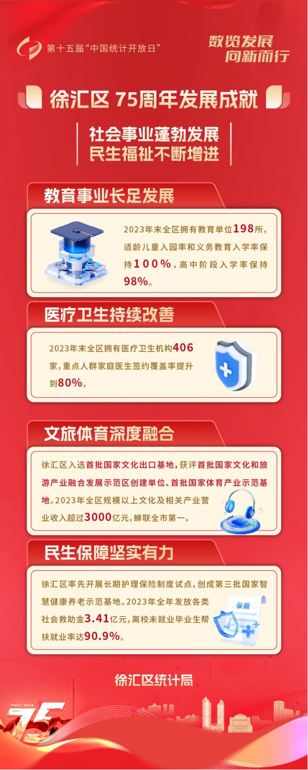 3.文旅体育深度融合:徐汇区入选首批国家文化出口基地,获评首批国家文化和旅游产业融合发展示范区创建单位、首批国家体育产业示范基地。2023年全区规模以上文化及相关产业营业收入超过3000亿元,蝉联全市第一。