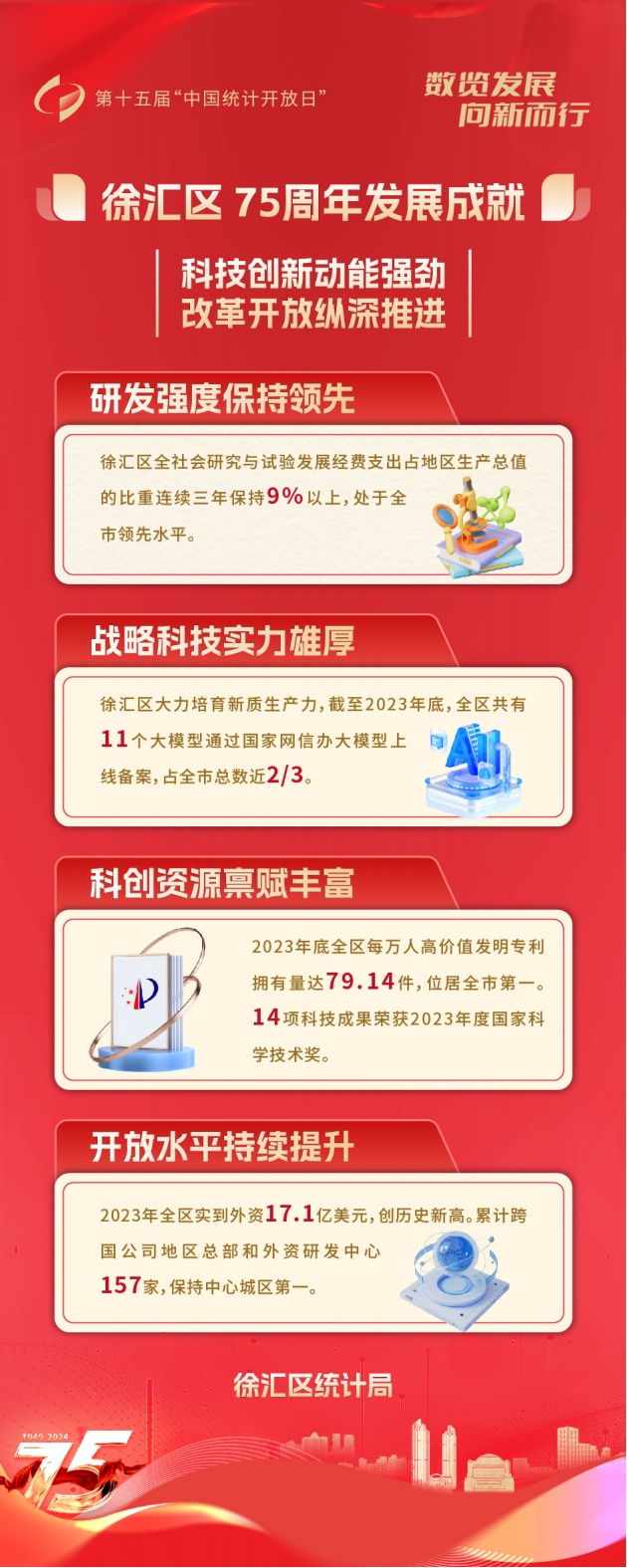 1.研发强度保持领先:徐汇区全社会研究与试验发展经费支出占地区生产总值的比重连续三年保持9%以上,处于全市领先水平。