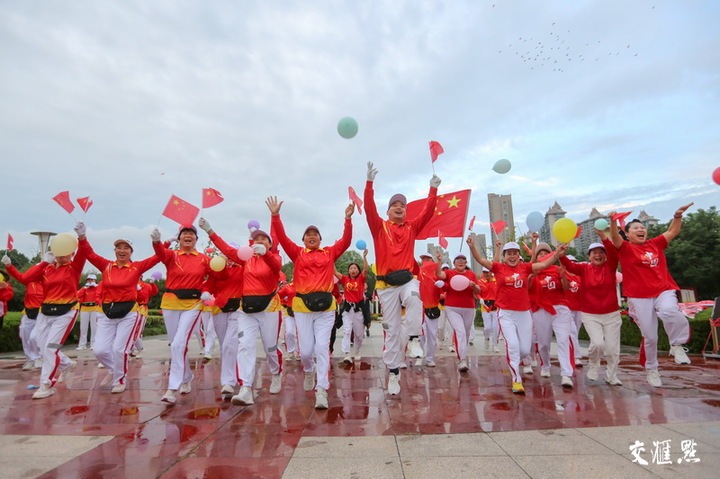 10月1日,沭阳县健身爱好者在法治文化公园广场上用歌声庆祝中华人民共和国成立75周年,祝愿祖国繁荣昌盛。岳华球 摄