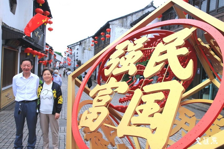 10月1日,苏州市姑苏区著名旅游景点山塘街,国旗飘扬,到处都洋溢着人们欢度国庆节的喜庆气氛。陈弋 摄