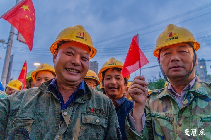 10月1日,泰州市姜堰区花园路一安居房施工工地,坚持节日加班的工人们施工前与国旗合影,以特别的方法庆祝新中国成立75周年。许大才 林露 摄