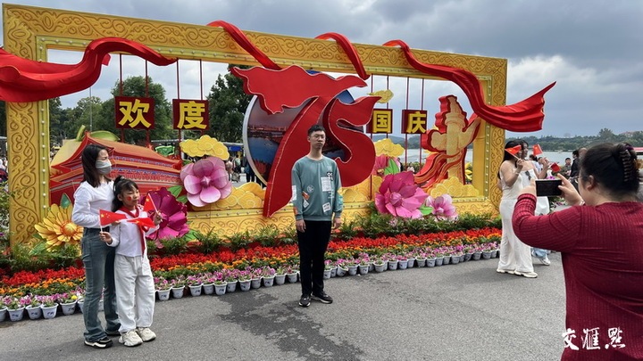 10月1日,市民、游客在南京玄武湖公园国庆主题花坛前留影,游园赏景欢度国庆假期。孙忠南 摄