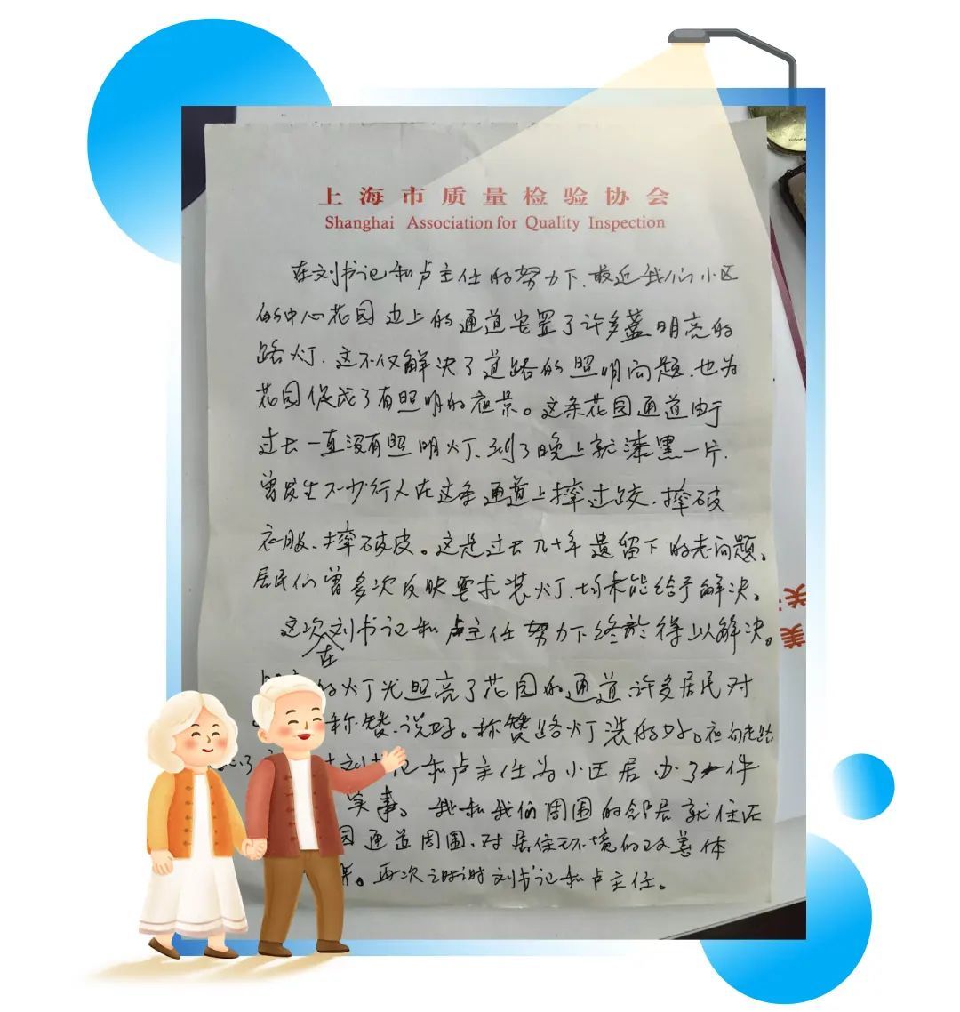 顾惠娣阿姨掩饰不住喜悦之情,拍了许多亮灯的照片还连夜让老伴写了感谢信交给居委会,她说:“感谢你们为小区居民办了一件好事、实事,我和我周围的邻居就住在这条花园通道周围,对居住环境的改善体会最深……”