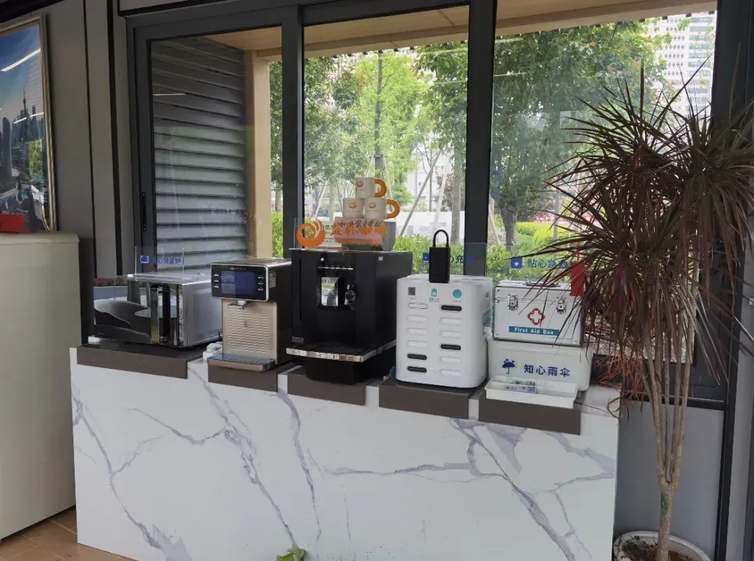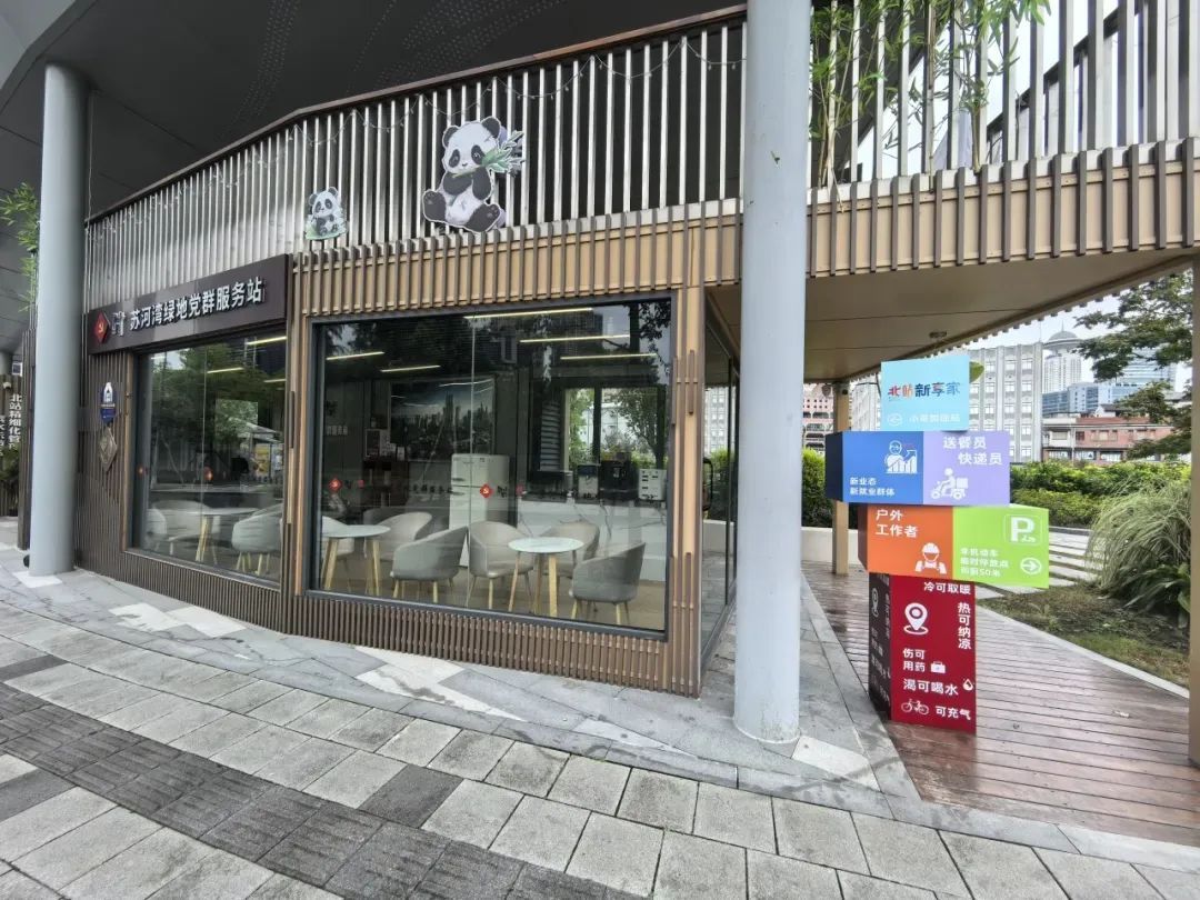 苏河湾绿地党群服务站是街道新兴领域党建全覆盖工作支撑保障的主阵地之一,也是街道专门为新兴领域群体打造的“北站新享家”党群服务阵地之一。服务站内配备了AED除颤器、急救包、微波炉、雨伞、无线网络、直饮水、充电器等免费设施,让快递外卖人员“冷可取暖、累可歇脚、伤可用药”,服务站还提供“创•先锋”“治•共享”“融•服务”三大主题项目,帮助提升快递外卖群体对城市的归属感,让“北站新享家”成为新就业群体的暖“新”家园。