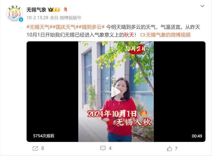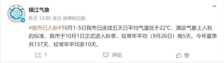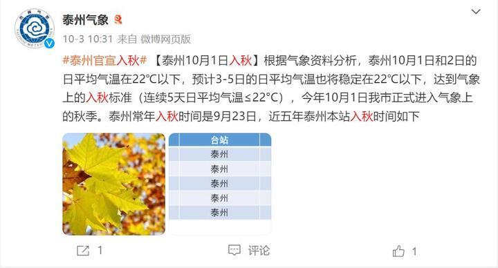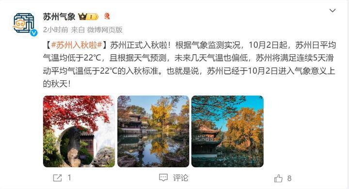 10月7日,苏州宣布入秋。根据苏州气象官方微博消息,从10月2日起,苏州的日平均气温均低于22℃,且未来几天气温也偏低,因此苏州于10月2日进入气象意义上的秋天。