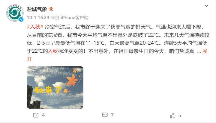 交汇点讯 随着国庆假期的结束,江苏多地也迎来了季节的更迭,纷纷宣布进入气象意义上的秋天。10月7日,新华日报·交汇点记者从江苏各地气象台官方微博统计发现,国庆期间,从无锡到连云港,我省多个城市在冷空气的影响下,完成了从夏到秋的转换。