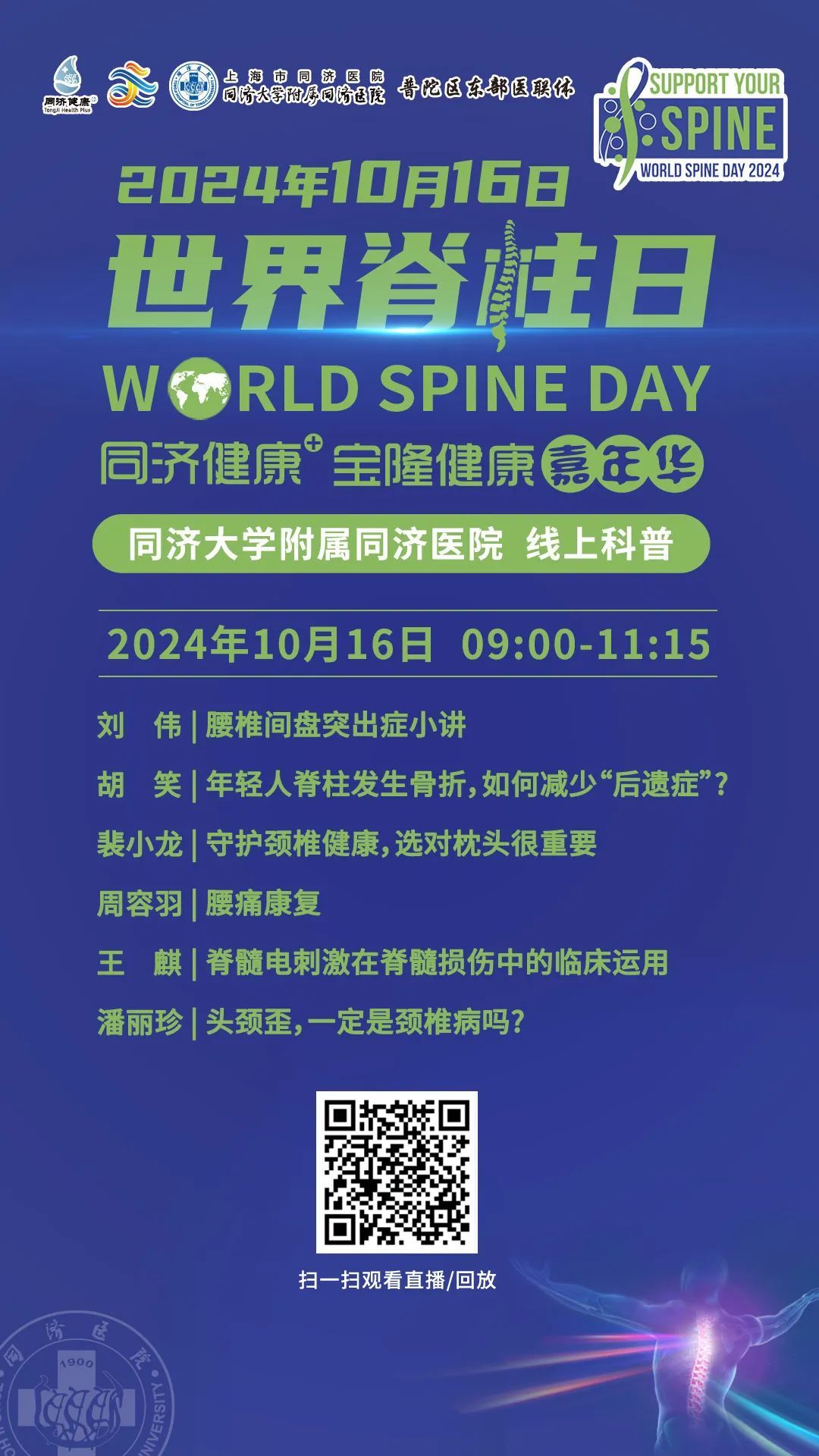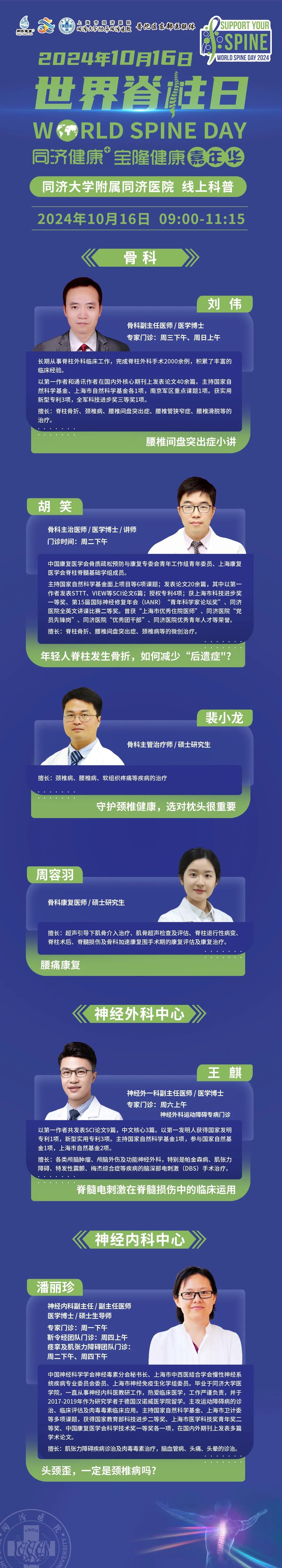 同济大学附属同济医院将于2024年10月16日上午9:00进行【世界脊柱日】科普直播。来自骨科、神经外科中心和神经内科中心的六位专家将从各个角度带来科普知识。
