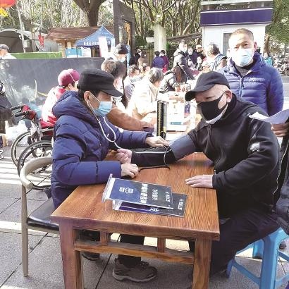 在人民公园门口,杨新华和癌症志愿者们设立了便民服务摊点,免费为路人测血压、称体重、修补、指路等。每5人一组,大家互相轮班,为的是保证病友的体力,提供更好的服务。据统计,10年来,杨新华和病友们累计为市民测量血压6万人次,测量血糖5千人次。