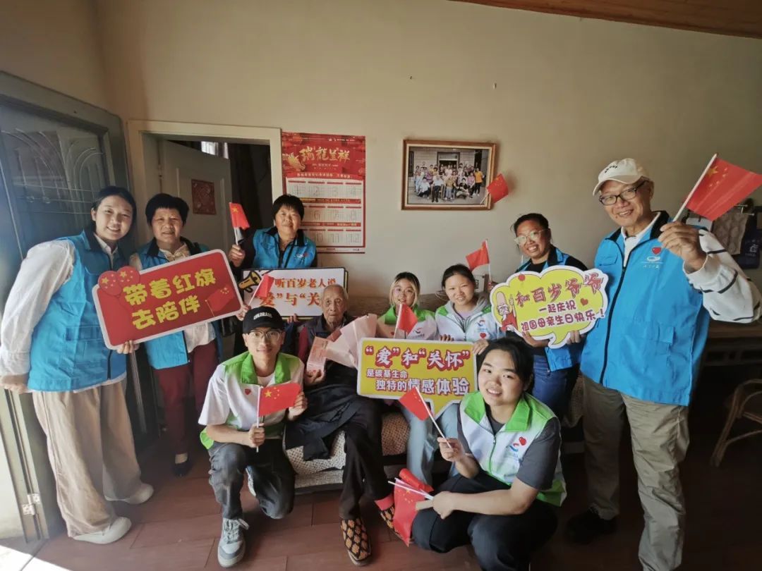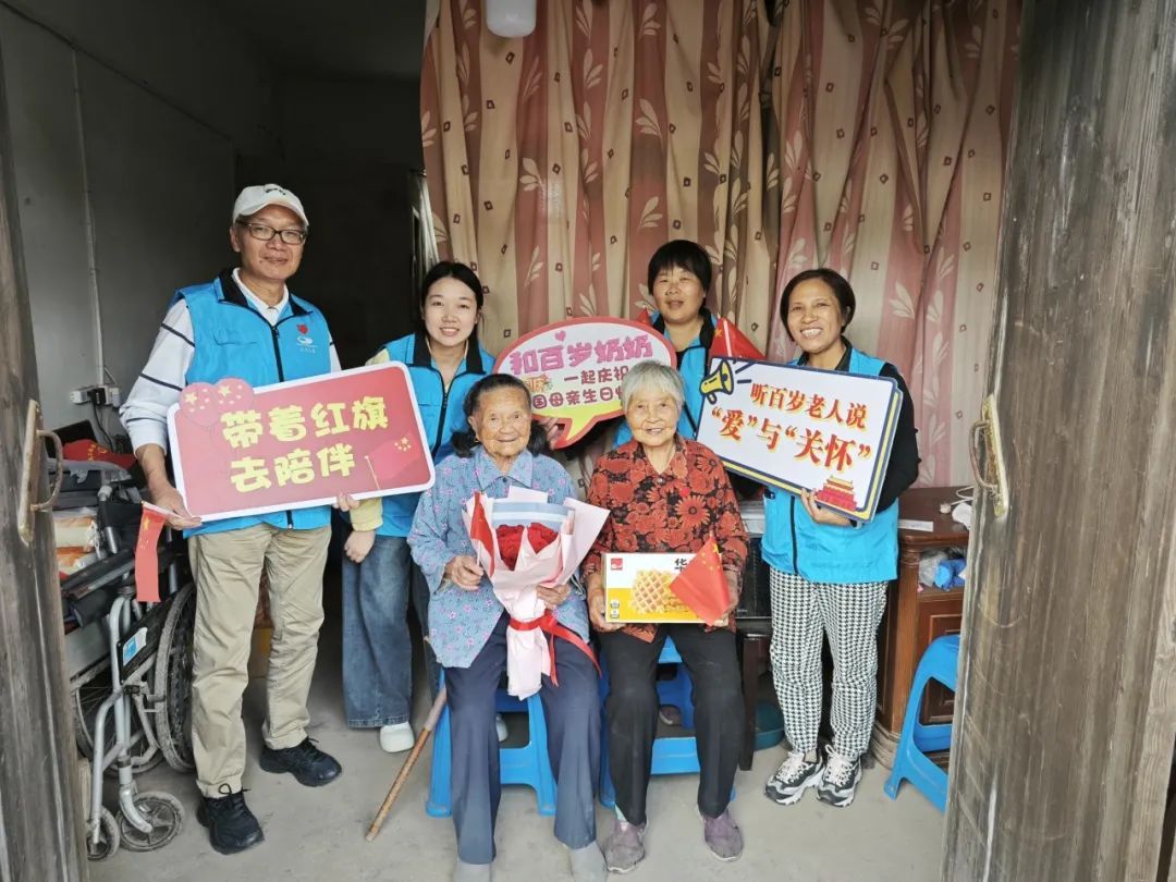 上海临港公益基金会在国庆期间组织志愿者走访慰问四团镇内的百岁老人,为他们送上鲜花和节日的慰问祝福。自2019年起,临港公益基金会已连续6年为四团镇的高龄独居老人开展公益帮扶和关心关爱活动。