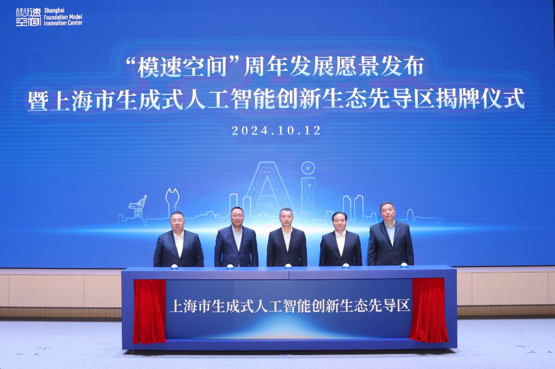 仪式上,陈杰、庄木弟、曹立强、戎之勤、袁国华共同为“上海市生成式人工智能创新生态先导区”揭牌。仪式上还展示了模速空间一周年发展成果,并发布上海市生成式人工智能创新生态先导区建设愿景。
