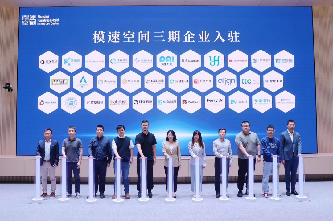 中国信通院“中国-金砖国家人工智能发展与合作中心”、开放原子(上海)开源促进中心、上海广播电视台“《未来中国》大模型专题节目和赛事”、中国电信人工智能研究院“星辰大模型”、华东师范大学“上海人工智能金融产业研究院”、阿里魔搭开放社区、上海天使会科创营“模速空间”分营等7个重大合作项目现场启动。边塞科技、派生万物、深思考等三十余家拟入驻三期企业,参加模速空间入驻仪式。