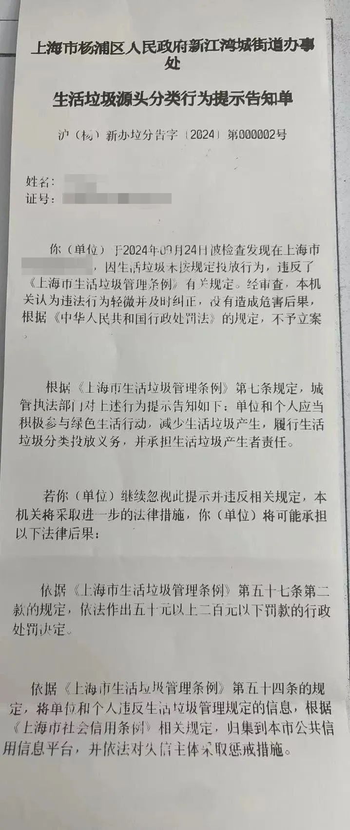 鉴于上述情况,新江湾城街道综合行政执法队并未直接采取处罚措施,而是根据《中华人民共和国行政处罚法》的相关规定,鉴于其违法行为轻微且及时纠正,未造成危害后果,决定不予立案,向其开出了杨浦区城管执法系统第一张《生活垃圾源头分类行为提示告知单》。
