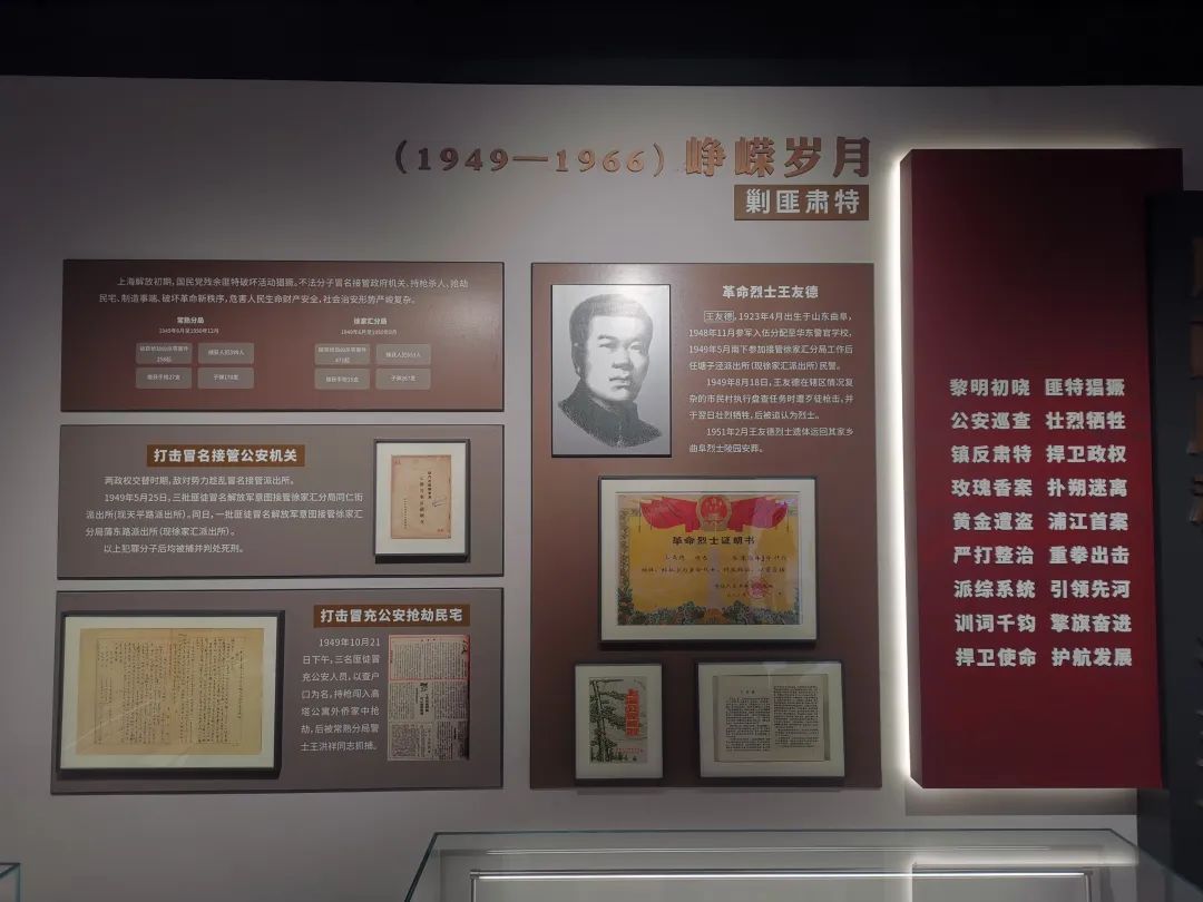 另一位是王友德烈士。他曾经是塘子泾派出所(现徐家汇派出所)民警,1949年8月18日在市民村(现乐山新村)附近执行盘查任务时,被歹徒持枪击中头部,不幸牺牲。当时因为条件有限,王友德烈士没能留下一张照片,在实践中心筹建的时候,徐汇公安分局经过多方努力,让画家根据王友德烈士亲属的形象以及描述还原而成,弥补了这一遗憾。