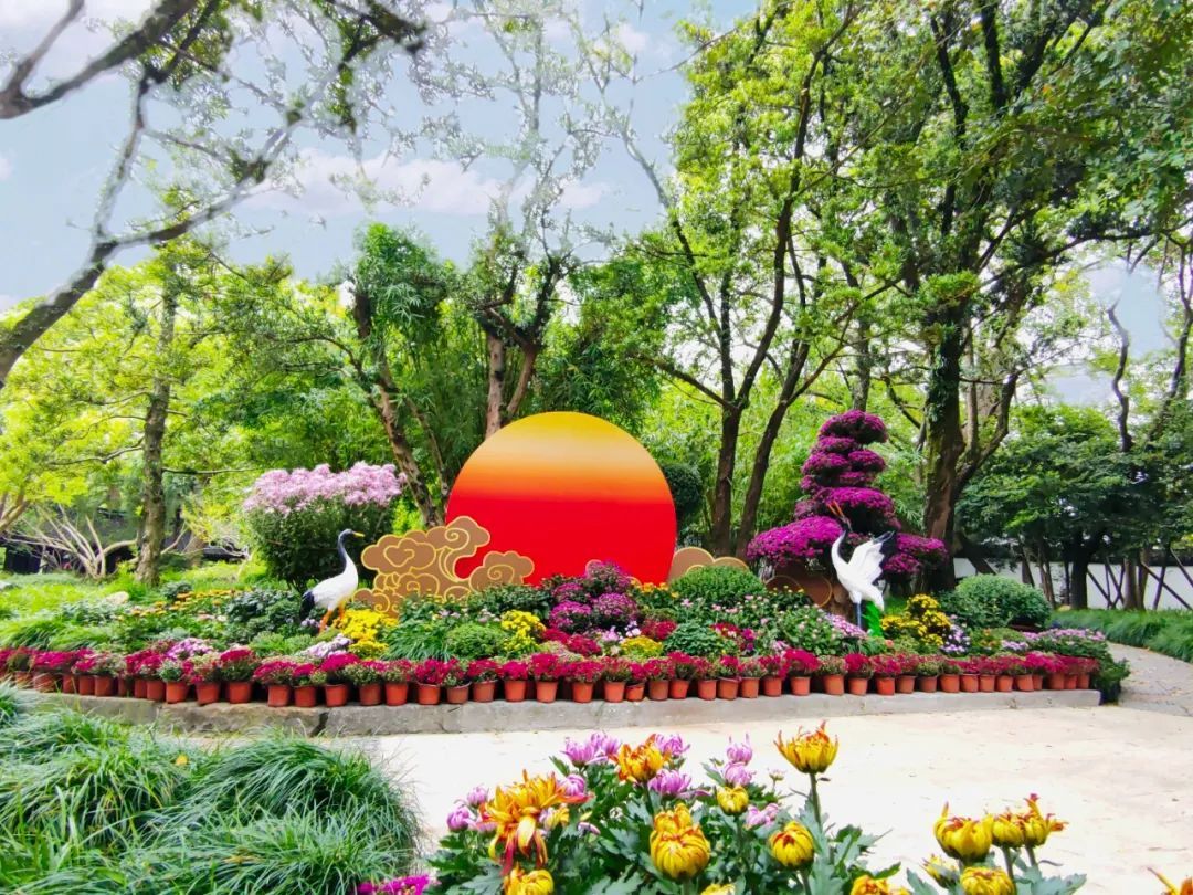 本届菊展以“品·秋华”为主题,以公园300米长主干道为主线,在西门照壁、水杉林、书法公园石刻、东门等处布置多处体量不一的菊文化主题景点。同时,融入仙鹤、仙鹿、日、月、山川等设计元素,利用现代公共艺术装置结合古典园林设计手法,赋予花展全新视觉感。