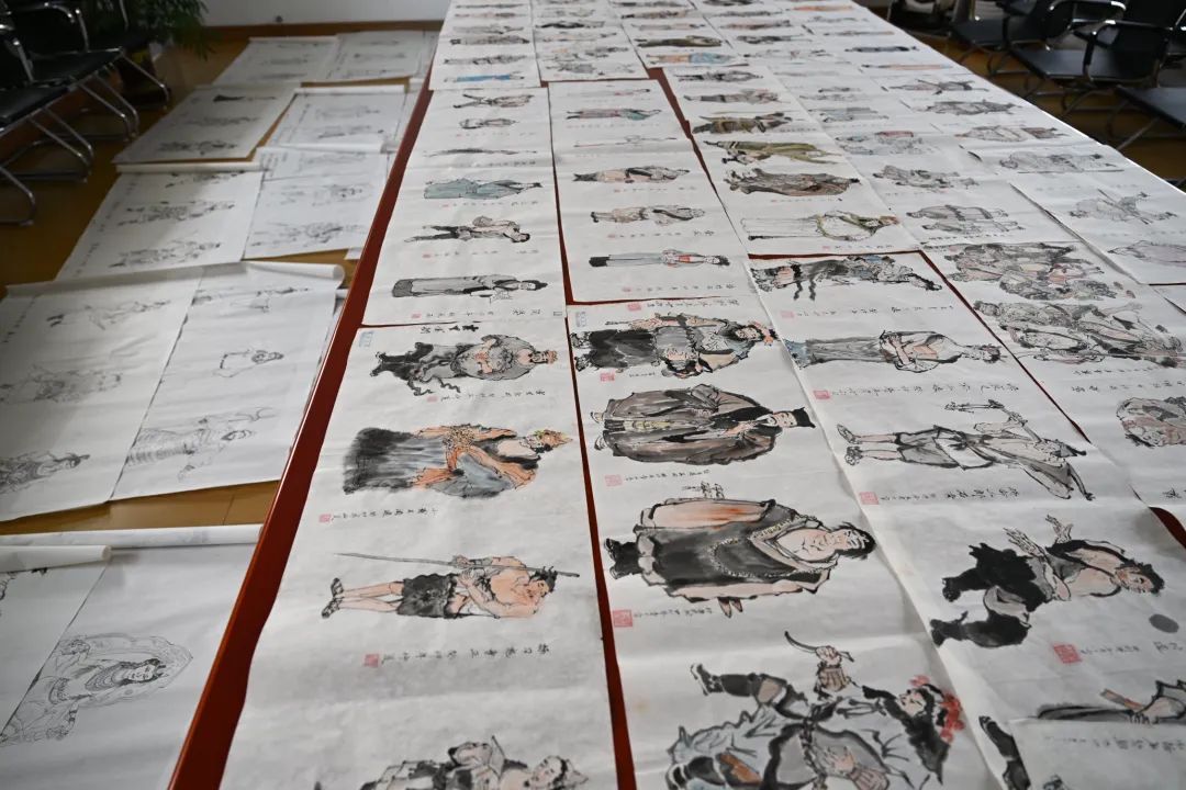 在徐行镇老年学校的一间教室里,水浒人物的画作洋洋洒洒地铺满了一桌一地,共有近200个,这些都是顾航花了一个多月时间陆续完成的。除了著名的一百单八将外,还有西门庆、高俅、阎婆惜等反面人物。