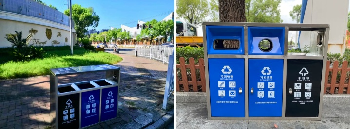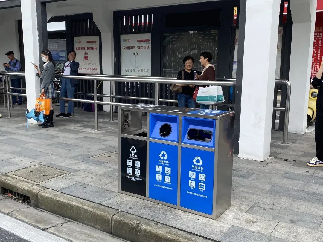 此外,在干净的基础上,为提升道路垃圾分类精细化水平,镇城建中心对全镇道路180个道路废物箱进行投口改造,保留原有干垃圾投口,对两个可回收物投口进行细化,以长条和圆形造型区分废纸张、废塑料瓶的投放。