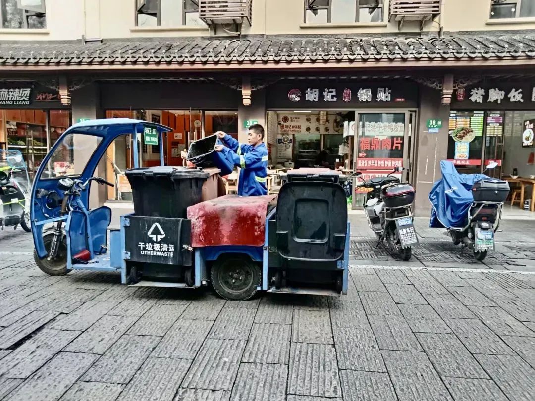 “从早上六点半到晚上九点半每天三次回收,回收频次比较高,一方面不至于商铺垃圾堆积,另一方面也方便环卫工作人员查看回收情况,要是出现错投、混装情况也能及时告诉他们,便于整改。”镇城建中心相关负责人介绍。