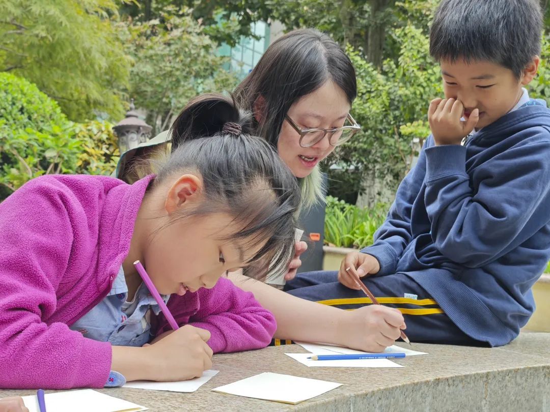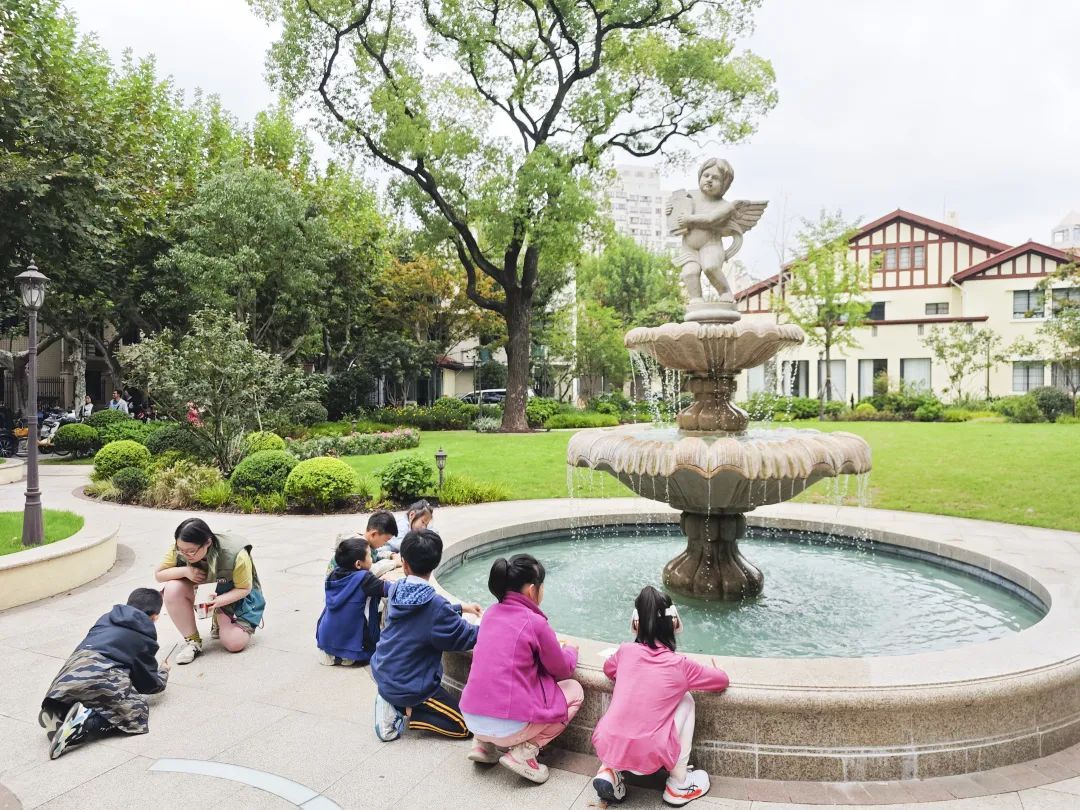 孩子们跟随老师的引导,认真品味着书中的文字,仿佛置身于一个全新的世界。接着,大家满怀期待地出发前往丽波水漾,用好奇的眼睛重新打量街道、街心公园和雕塑。建筑与雕塑、街道与行人、花与树、苔藓与石头,甚至是路面下水口的窄缝,在孩子们的眼中都拥有了全新的角色,变得更加生动有趣。