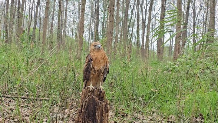 虽然阔别野外一年,但这只普通鵟知道前路在何方。重回野外,它轻轻抖动翅膀,用力一蹬脚下的树桩,没一会儿就振翅高飞,毅然决然地朝着远方飞去。