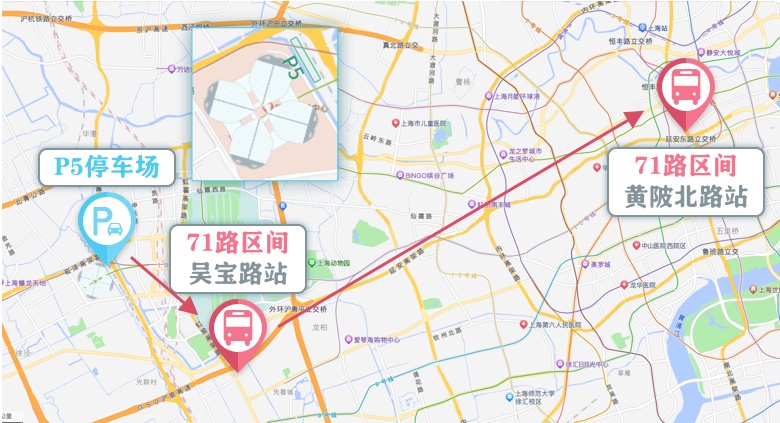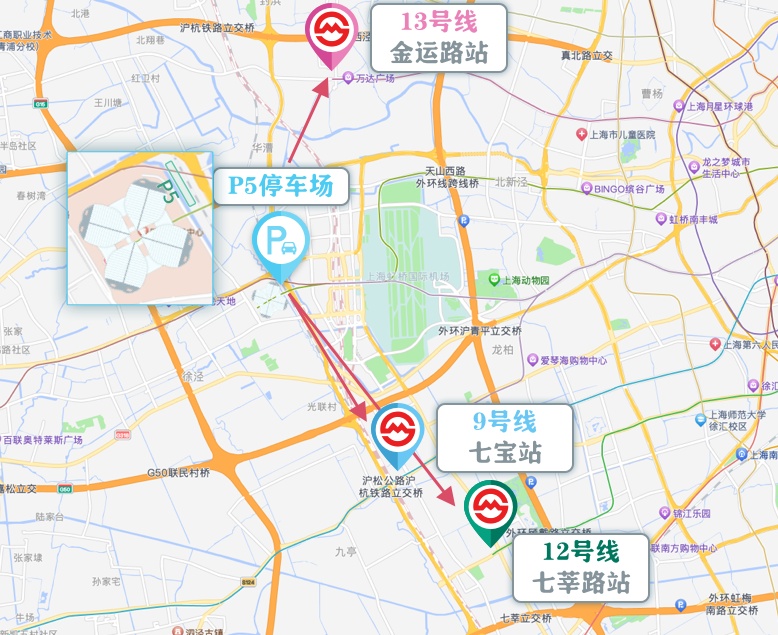 展会期间每日离场时段(15时至20时),在 P5停车场内各设置3条轨道交通接驳线,分别开往9号线七宝站、12号线七莘路站、13号线金运路站。