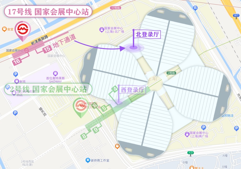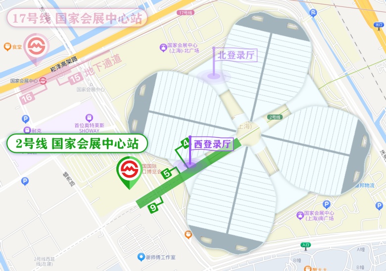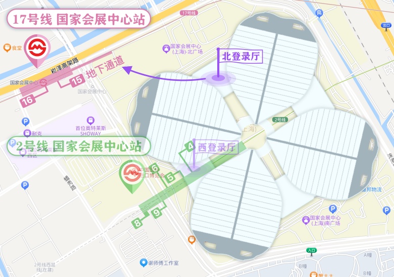 观众到达国家会展中心站后,通过过街地道直通场馆北广场,从北登录厅入场。